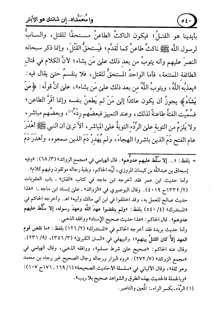 بأيدينا هو القتلُ؛ فيكون الناكثُ الطاعنُ مستحقًّا للقتل، والسابُّ لرسول الله - صلى الله عليه وسلم - ناكثٌ طاعنٌ كما تَقدَّم؛ فيَستحقُّ القَتْلَ، وإنما ذكر سبحانه النصرَ عليهم وأنه يتوبُ من بعدِ ذلك على مَن يشاء؛ لأنَّ الكلام في قتالِ الطائفةِ الممتنعة، فأما الواحدُ المستحقُّ للقتل، فلا ينقسمُ حتى يقال فيه: "يعذبُه اللهُ، ويتوبُ اللهُ مِن بعد ذلك على مَن يشاء"، على أن قولَه: {مَنْ يشاءُ} يجوزُ أن يكون عائدًا إلى مَنْ لم يَطعنْ بنفسه وإنما أقَرَّ الطاعن؛ فسُمِّيت الفئةُ طاعنةً لذلك، وعند التمييز فبعضُهم رِدْءٌ (¬1)، وبعضُهم مباشر، ولا يَلزمُ من التوبةِ على الرِّدْءِ التوبةُ على المباشر، ألاَ ترى أن النبي - صلى الله عليه وسلم - أهْدَرَ عام الفتح دَمَ الذين باشروا الهجاءَ، ولم يُهْدِرْ دَمَ الذين سمعوه، وأهدَرَ دَمَ