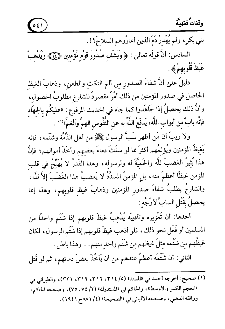 ولا ريبَ أن مَن أظهر سَبَّ الرسول - صلى الله عليه وسلم - من أهل الذِّمَّة وشَتَمه، فإنه يَغِيظُ المؤمنين ويُؤلِمُهم أكثرَ مما لو سفَكَ دماءَ بعضِهِم وأخَذَ أموالهم؛ فإن هذا يُثِيرُ الغضبَ لله والحَمِيَّةَ له ولرسولِه، وهذا القَدرُ لا يُهَيِّجُ في قلبِ المؤمن غيظًا أعظمَ منه، بل المؤمن المسدَّدُ لا يَغضبُ هذا الغَضَبَ إلاَّ لله، والشارعُ يطلبُ شفاءَ صدورِ المؤمنين وذهابَ غيظِ قلوبِهم، وهذا إنما يحصلُ بِقَتْل السابِّ لأوْجُهٍ: