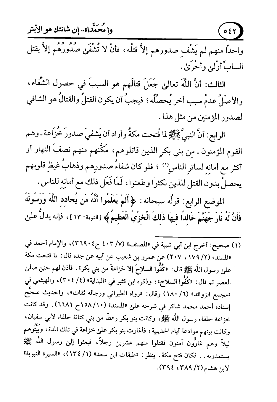 الرابع: أنَّ النبيَّ - صلى الله عليه وسلم - لما فُتحت مكةُ وأراد أن يَشفيَ صدورَ خُزَاعة -وهم القوم المؤمنون- مِن بني بكرٍ الذين قاتلوهم، مَكَّنهم منهم نصفَ النهار أو أكثر مع أمانِهِ لسائرِ الناسِ (¬1)؛ فلو كان شفاءُ صدورِهم وذهابُ غيظِ قلوبهم يحصلُ بدون القتل للذين نكثوا وطعنوا، لَمَا فَعَل ذلك مع أمانِهِ للناس.