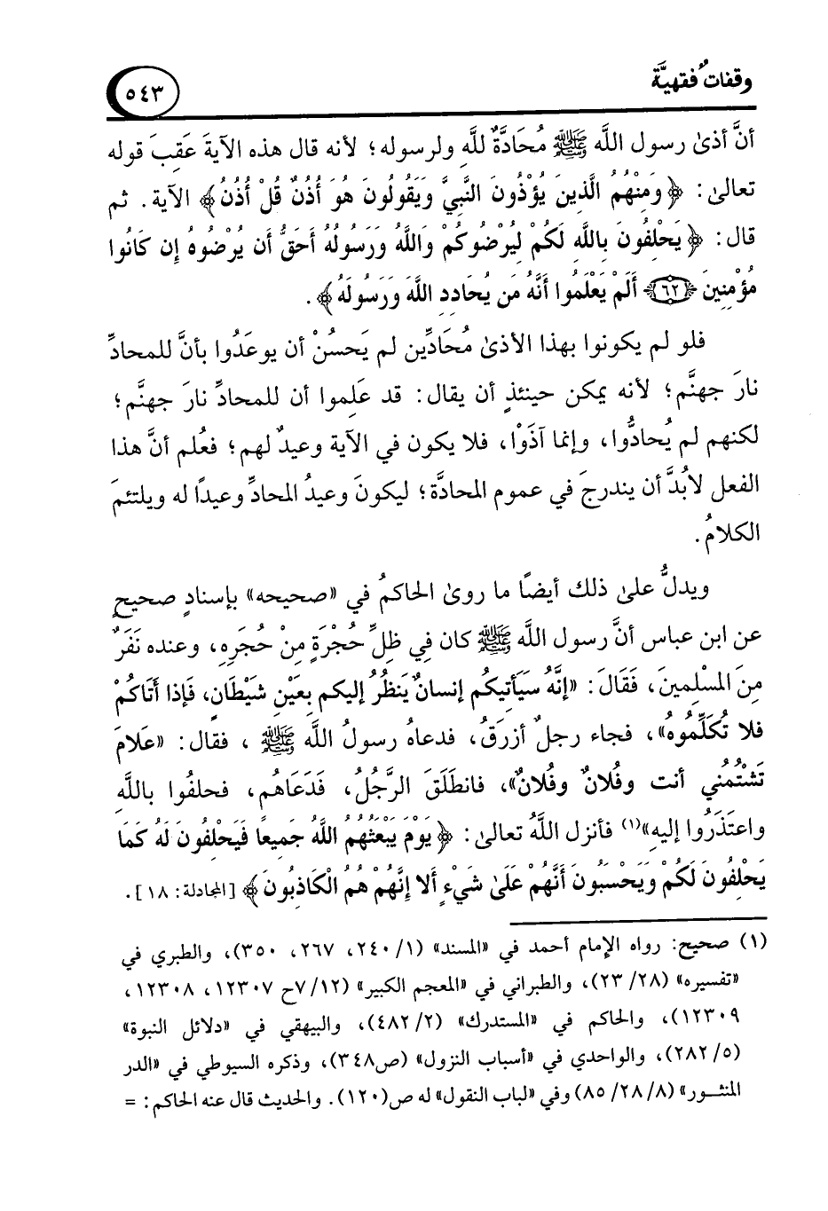 ويدل على ذلك أيضًا ما روى الحاكمُ في "صحيحه" بإسنادٍ صحيحٍ عن ابن عباس أنَّ رسول الله - صلى الله عليه وسلم - كان فِي ظِلِّ حُجْرَةٍ مِنْ حُجَرِهِ، وعنده نَفرٌ مِنَ المسْلِمينَ، فَقَالَ: "إنَّهُ سَيَأتِيكُم إنسانٌ يَنظُرُ إليكم بعَيْنِ شَيْطَانٍ، فَإذا أَتَاكُمْ فلا تُكَلِّمُوهُ"، فجاء رجلٌ أزرَقُ، فدعاهُ رسولُ اللهَ - صلى الله عليه وسلم -، فقال: "عَلامَ تَشْتُمُني أنت وفُلانٌ وفُلانٌ"، فانطَلَقَ الرجُلُ، فَدَعَاهُمِ، فحلفُوا باللهِ واعتَذَرُوا إليهِ" (¬1) فأنزل اللهُ تعالى: {يَوْمَ يَبْعَثُهُمُ اللَّهُ جَمِيعًا فَيَحْلِفُونَ لَهُ كَمَا يَحْلِفُونَ لَكُمْ وَيَحْسَبُونَ أَنَّهُمْ عَلَى شَيْءٍ أَلَا إِنَّهُمْ هُمُ الْكَاذِبُونَ} [المجادلة: 18].