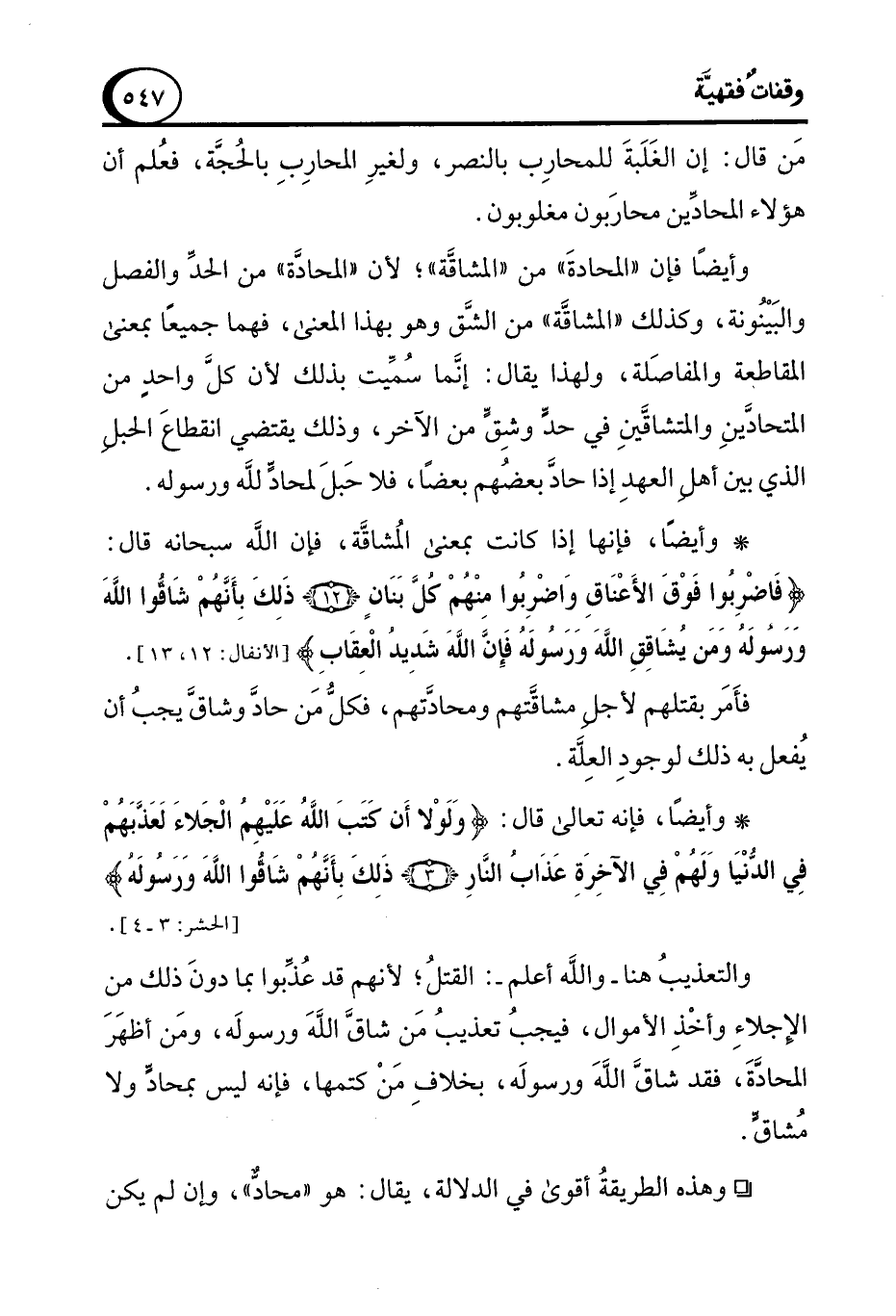 وأيضاً فإن "المحادةَ" من "المشاقَّة"؛ لأن "المحادَّة" من الحدِّ والفصل والبَيْنُونة، وكذلك "المشاقَّة" من الشَّق وهو بهذا المعنى، فهما جميعًا بمعنى المقاطعة والمفاصَلة، ولهذا يقال: إنَما سُمِّيت بذلك لأن كلَّ واحدٍ من المتحادَّينِ والمتشاقَّينِ في حدٍّ وشِقٍّ من الآخر، وذلك يقتضي انقطاعَ الحبلِ الذي بين أهل العهدِ إذا حادٍّ بعضُهم بعضًا، فلا حَبلَ لمحادٍّ لله ورسوله.