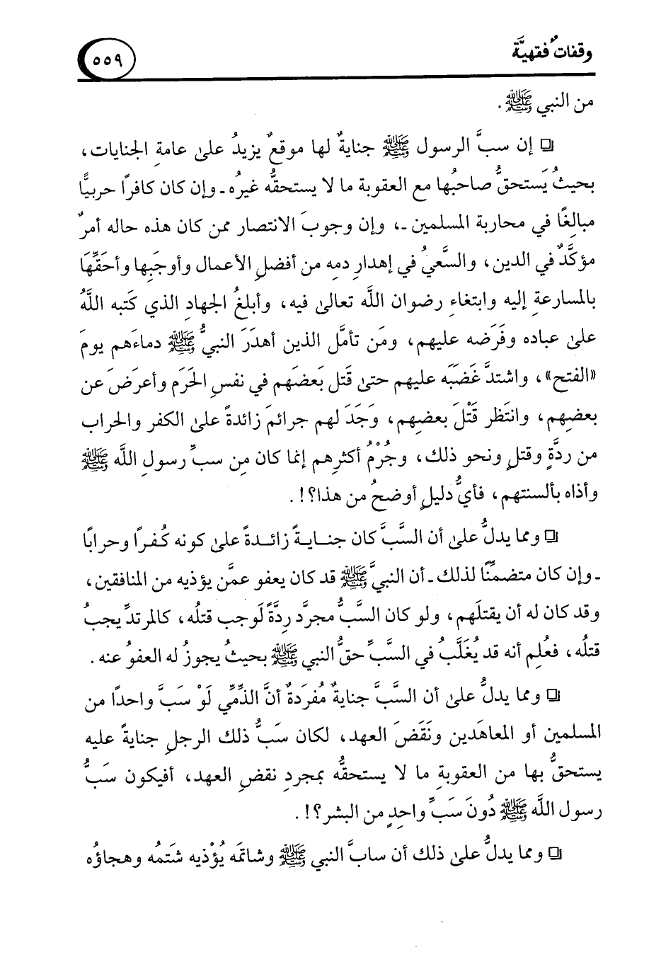 ° إن سبَّ الرسول - صلى الله عليه وسلم - جنايةٌ لها موقعٌ يزيدُ على عامةِ الجنايات، بحيثُ يَستحقُّ صاحبُها مع العقوبة ما لا يستحقُّه غيرُه -وإن كان كافرًا حربيًّا مبالِغًا في محاربة المسلمين-، وإن وجوبَ الانتصار ممن كان هذه حاله أمرٌ مؤكَّدٌ في الدين، والسَّعيُ في إهدارِ دمِه من أفضالِ الأعمال وأوجَبِها وأحَقِّهَا بالمسارعةِ إليه وابتغاءِ رضوان الله تعالى فيه، وأبلغُ الجهادِ الذي كَتبه الله على عباده وفَرَضه عليهم، ومَن تأمَّل الذين أهدَرَ النبي - صلى الله عليه وسلم - دماءَهمِ يومَ "الفتح"، واشتدَّ غَضَبَه عليهم حتى قَتل بَعضَهم في نفسِ الحَرَم وأعرَض عن بعضِهم، وانتَظر قَتْلَ بعضِهم، وَجَدَ لهم جرائمَ زائدةً على الكفر والحراب من ردَّة وقتل ونحو ذلك، وجُرْم أكثرِهم إنما كان مِن سبِّ رسولِ الله - صلى الله عليه وسلم - وأذاه بألسنتهم، فأيُّ دليل أوضح من هذا؟!.