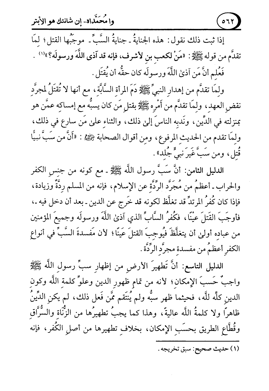 ولِمَا تقدَّم من إهدارِ النبيِّ - صلى الله عليه وسلم - دَمَ المرأةِ السَّابَّةِ، مع أنها لا تُقتَلُ لمجرَّدِ نقضِ العهدِ، ولِمَا تقدَّم من أَمْرِه - صلى الله عليه وسلم - بقتل مَن كان يسبُّه مع إمساكِه عمّن هو بمنزلته في الدِّين، ونَدبِه الناسَ إلى ذلك، والثناءِ على مَن سارع في ذلك، ولِمَا تقدم من الحديثِ المرفوع، ومِن أقوال الصحابة - رضي الله عنه -: "أَنَّ من سَبَّ نبيًّا قُتِل، ومن سَبَّ غَيرَ نبيٍّ جُلِد".