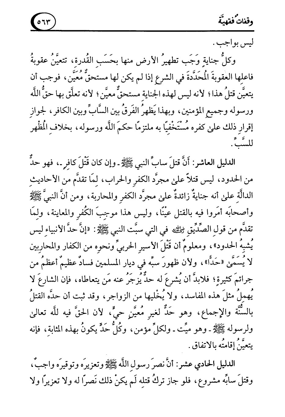 الدليل العاشر: أَنَّ قتلَ سابِّ النبي - صلى الله عليه وسلم - وإن كان قَتْلَ كافِرٍ-، فهو حدٌّ من الحدود، ليس قتلاً على مجرَّد الكفرِ والحراب، لِمَا تقدَّم من الأحاديثِ الدالَّةِ على أنه جنايةٌ زائدةٌ على مجرَّد الكفرِ والمحاربة، ومن أنَّ النبيَّ - صلى الله عليه وسلم - وأصحابَه أمَروا فيه بالقتل عيْنًا وليس هذا موجِبَ الكُفرِ والمعاينة، ولِمَا تقدَّم من قولِ الصِّدِّيقِ - رضي الله عنه - في التي سبَّت النبي - صلى الله عليه وسلم -: "إنَّ حدَّ الأنبياءِ ليس يُشبِهُ الحدود"، ومعلومٌ أن قَتْلَ الأسيرِ الحربيِّ ونحوِه من الكفار والمحارِبين لا يُسَمَّى "حَدًّا"، ولأن ظهورَ سبِّه في ديار المسلمين فسادٌ عظيمٌ أعظمُ من جرائمَ كثيرةٍ؛ فلابدَّ أن يُشرعَ له حدٌّ يُزجَرُ عنه مَن يتعاطاه، فإن الشارعَ لا يُهمِلُ مثلَ هذه المفاسد، ولا يُخْليها من الزواجر، وقد ثبت أن حدَّه القتلُ بالسُّنَّة والإجماع، وهو حَدٌّ لغيرِ مُعيَّنٍ حيٍّ، لأن الحقَّ فيه لله تعالى ولرسوله - صلى الله عليه وسلم - وهو ميِّت- ولكلِّ مؤمن، وكُلُّ حَدٍّ يكونُ بهذه المثابةِ، فإنه يتعيَّنُ إقامتُه بالاتفاق.
