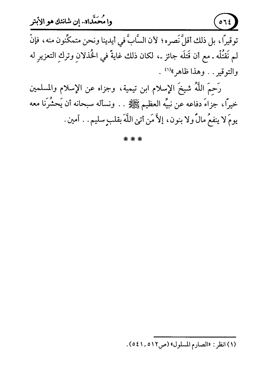 رَحِمَ اللهُ شيخَ الإسلام ابن تيمية، وجزاه عن الإسلامِ والمسلمين خيرًا، جزاءَ دفاعه عن نبيِّه العظيم - صلى الله عليه وسلم - .. ونسأله سبحانه أن يحشُرَنا معه يومَ لا ينفعُ مالٌ ولا بنون، إلاَّ مَن أتى اللهَ بقلبٍ سليم .. آمين.
