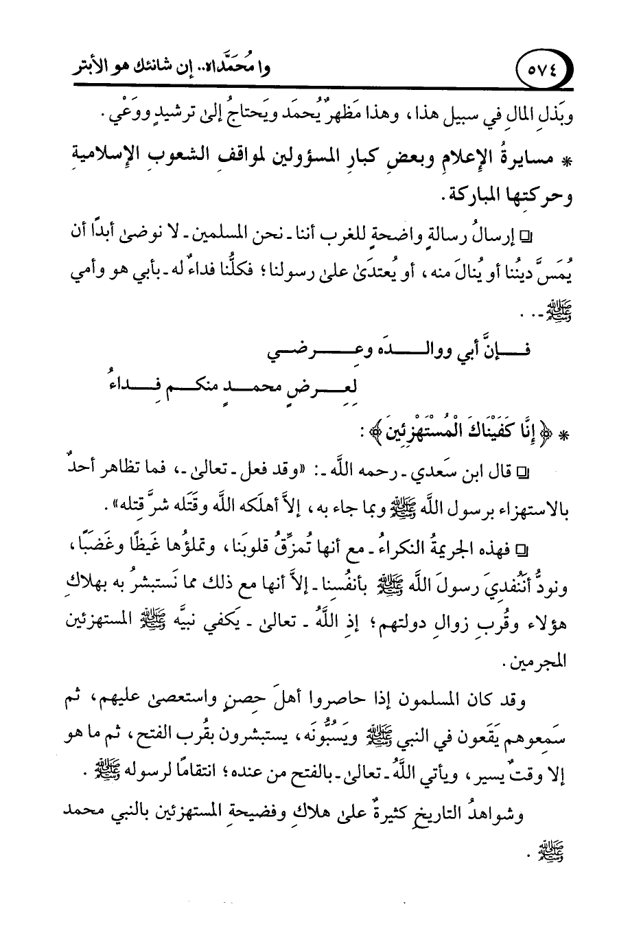 ° فهذه الجريمةُ النكراءُ -مع أنها تُمزِّقُ قلوبَنا، وتملؤُها غَيظًا وغَضَبًا، ونودُّ أن نفدِيَ رسولَ الله - صلى الله عليه وسلم - بأنفُسِنا- إلاَّ أنها مع ذلك مما نَستبشرُ به بهلاكِ هؤلاء وقُربِ زوالِ دولتهم، إذِ اللهُ -تعالى- يَكفي نبيَّه - صلى الله عليه وسلم - المستهزئين المجرمين.
