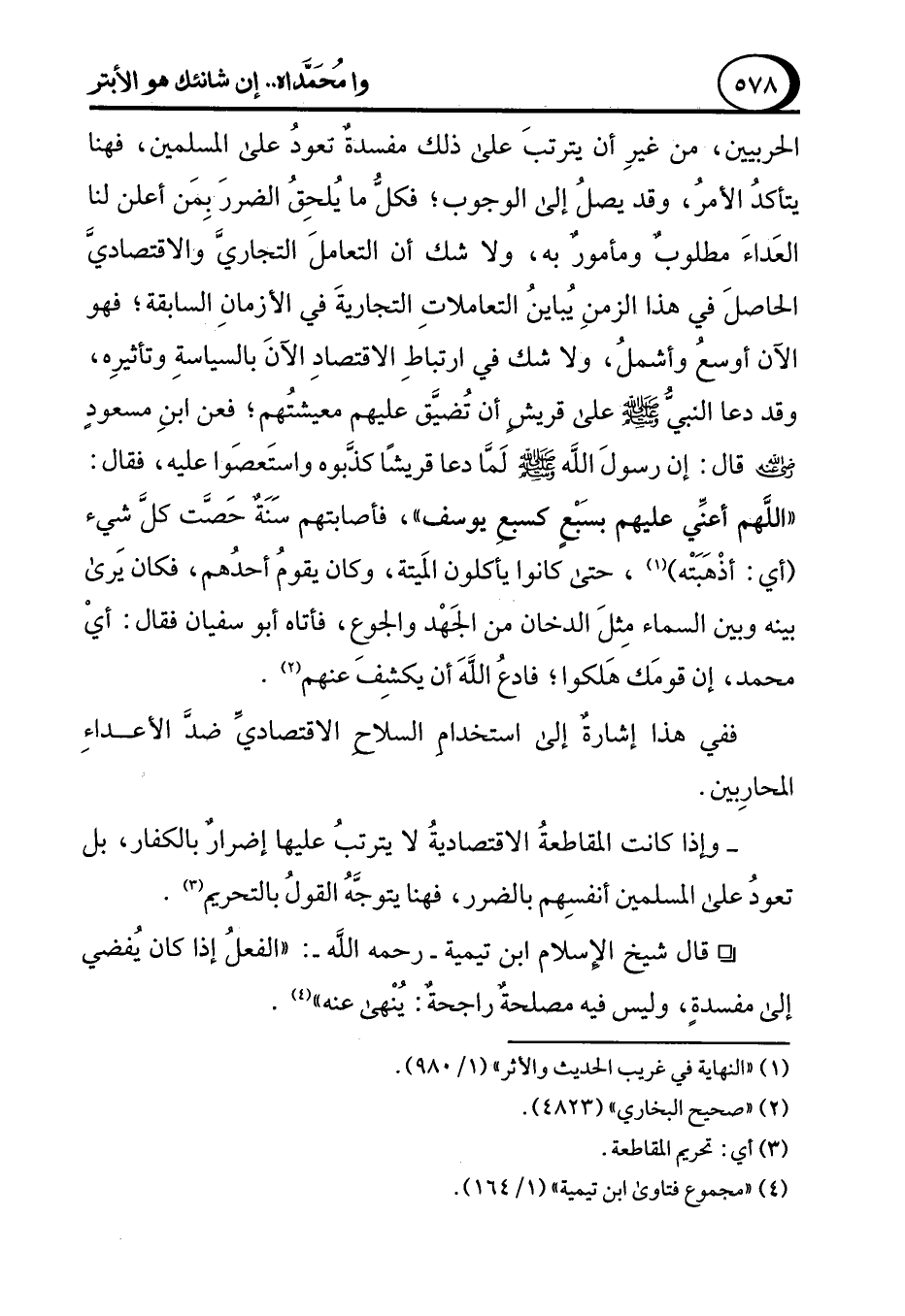 الحربيين، من غيرِ أن يترتبَ على ذلك مفسدة تعودُ على المسلمين، فهنا يتأكدُ الأمرُ، وقد يصلُ إلى الوجوب؛ فكل ما يُلحِق الضررَ بِمَن أعلن لنا العَداءَ مطلوبٌ ومأمور به، ولا شك أن التعاملَ التجاريَّ والاقتصاديَّ الحاصلَ في هذا الزمنِ يُباينُ التعاملاتِ التجاريةَ في الأزمانِ السابقة؛ فهو الآن أوسعُ وأشملُ، ولا شك في ارتباطِ الاقتصادِ الآنَ بالسياسةِ وتأثيرِه، وقد دعا النبي - صلى الله عليه وسلم - على قريش أن تُضيَّق عليهم معيشتُهم؛ فعن ابنِ مسعودٍ - رضي الله عنه - قال: إن رسولَ الله - صلى الله عليه وسلم - لَمَّا دعا قريشًا كذبوه واستَعصَوا عليه، فقال: "اللهم أعنِّي عليهم بسَبعٍ كسبع يوسف"، فأصابتهم سَنَةٌ حَصَّت كل شيء (أي: أذْهَبَتْه) (¬1)، حتى كانوا يأكلون المَيتة، وكان يقومُ أحدُهم، فكان يَرى بينه وبين السماء مِثلَ الدخان من الجَهْد والجوع، فأتاه أبو سفيان فقال: أيْ محمد، إن قومَك هَلكوا، فادعُ اللهَ أن يكشِفَ عنهم (¬2).