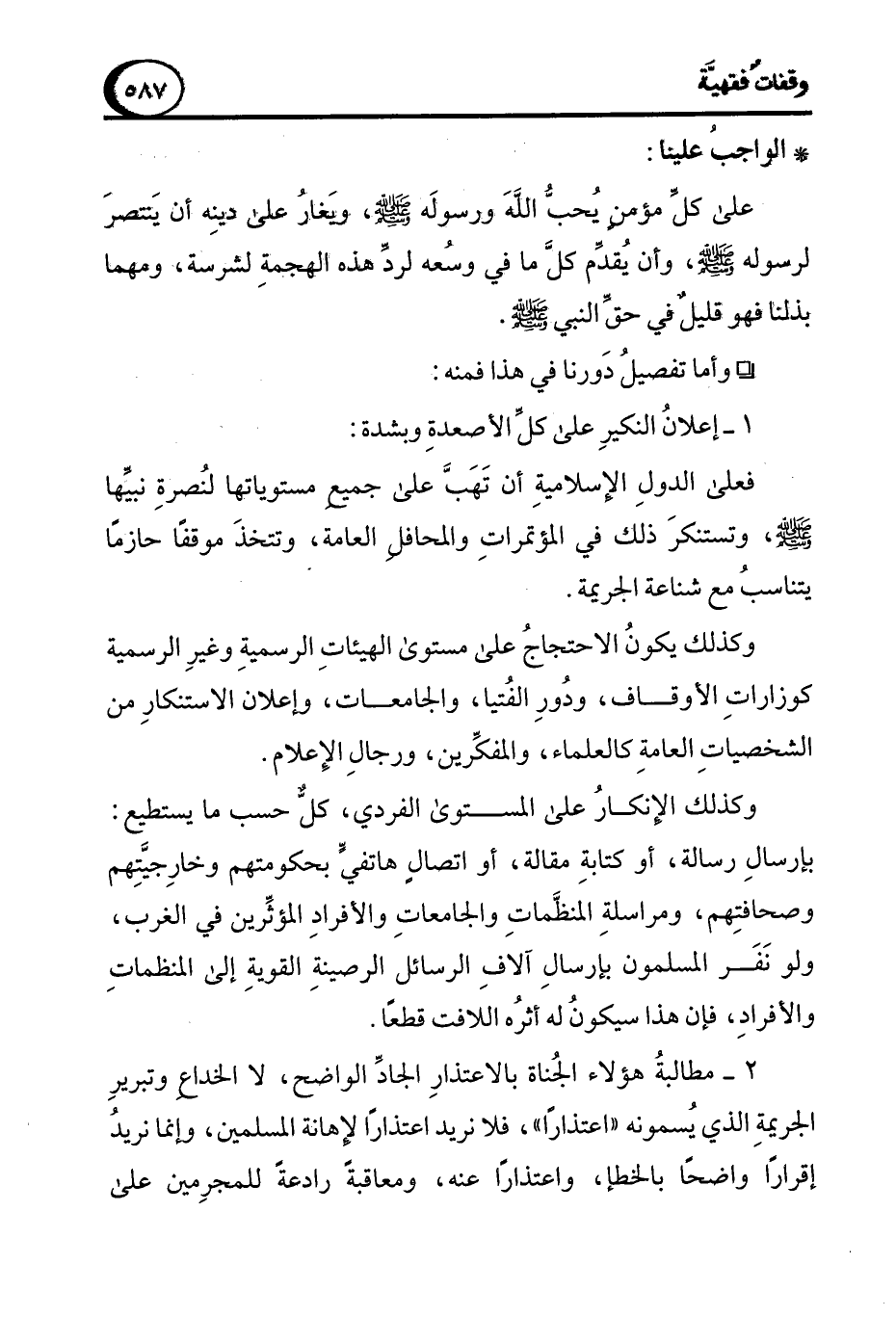 - فعلى الدولِ الإسلاميةِ أن تَهَبَّ على جميعِ مستوياتها لنُصرةِ نبيِّها - صلى الله عليه وسلم -، وتستنكرَ ذلك في المؤتمراتِ والمحافل العامة، وتتخذَ موقفًا حازمًا يتناسبُ مع شناعة الجريمة.
