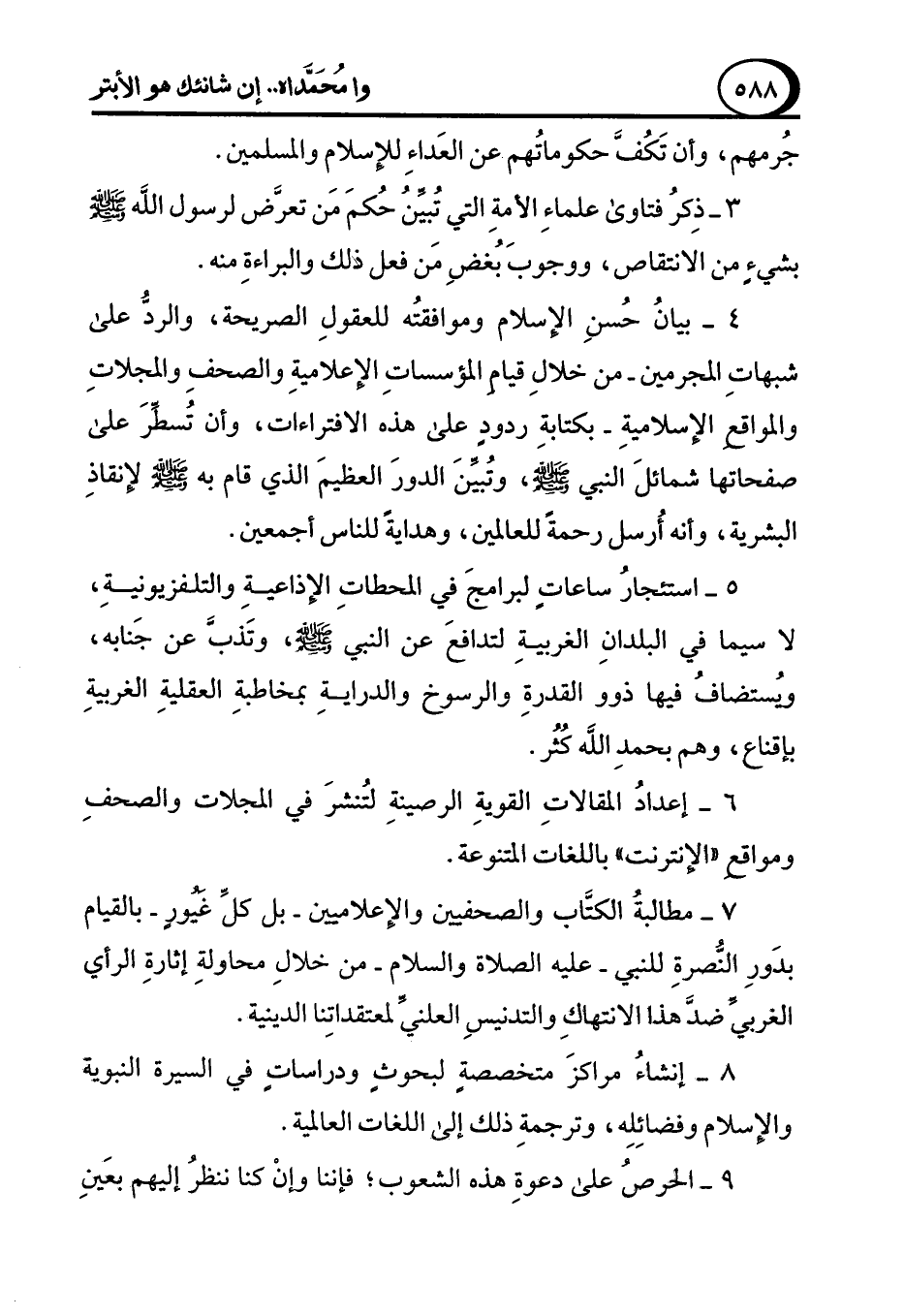 5 - استئجارُ ساعاتٍ لبرامجَ في المحطاتِ الإذاعيةِ والتلفزيونيةِ، لا سيما في البلدانِ الغربيةِ لتدافعَ عن النبي - صلى الله عليه وسلم -، وتَذبَّ عن جَنابه، ويُستضافُ فيها ذوو القدرةِ والرسوخ والدرايةِ بمخاطبةِ العقليةِ الغربيةِ بإقناع، وهم بحمدِ الله كُثُر.