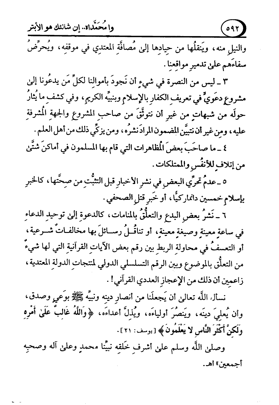 نسأل الله تعالى أن يَجعلَنا من أنصارِ دينِه ونبيِّه - صلى الله عليه وسلم - بوَعيٍ وصدق، وأن يُعلِيَ دينَه، ويَنصُرَ أولياءَه، ويُذِلَّ أعداءَه، {وَاللَّهُ غَالِبٌ عَلَى أَمْرِهِ وَلَكِنَّ أَكْثَرَ النَّاسِ لَا يَعْلَمُونَ} [يوسف: 21].