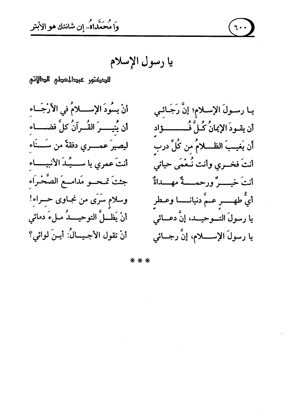 يا رسولَ الإسلامِ؛ إنَّ رَجَائِي ... أنْ يسُودَ الإسلامُ في الأرْجَاءِ