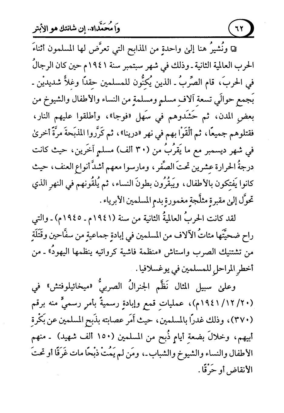 ° ونُشيرُ هنا إلى واحدةٍ من المذابح التي تعرَّض لها المسلمون أثناءَ الحرب العالمية الثانية -وذلك في شهر سبتمبر سنة 1941 م حين كان الرجالُ في الحربَ، قام الصرب -الذين يُكِنُّون للمسلمين حِقدًا وغِلاًّ شديديْن- بَجمع حوالَي تسعةِ آلافِ مسلم ومسلمةٍ من النساء والأطفال والشيوخ من بعضِ المدن، ثم حَشَدوهم في سهل "فوجا"، وأطلقوا عليهم النار، فقتلوهم جميعًا، ثم الْقَوْا بهم في نهر "درينا"، ثم كَرَّروا المذبَحةَ مرَّةً أخرى في شهر ديسمبر مع ما يَقرُب من (30 ألف) مسلم آخَرين، حيث كانت درجة الحرارة عِشرين تحتَ الصِّفر، ومارسوا معهم أشدَّ أنواع العنف، حيث كانوا يَفتِكون بالأطفال، ويَبقُرُون بطونَ النساء، ثم يلقُونهم في النهرِ الذي تحوَّل إلى مقبرةٍ مثلَّجةٍ مغمورةٍ بدم المسلمين الأبرياء.