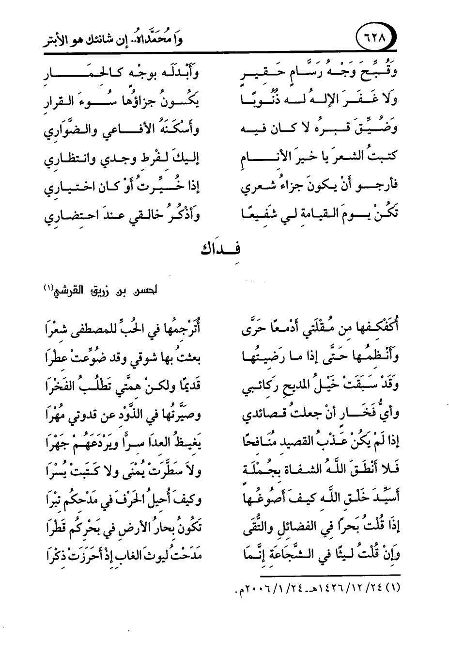 أُكَفْكِفها مِن مُقْلَتي أَدْمعًا حَرَّى ... أُتَرْجِمُها في الحُبِّ للمصطفى شِعْرَا