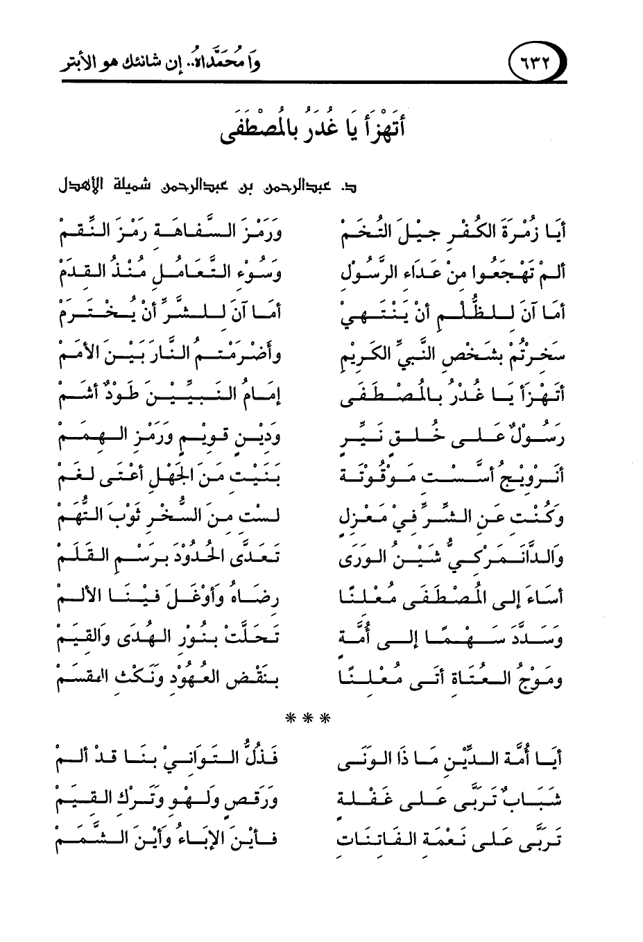 أتَهْزَأ يَا غُدْرُ بالمُصْطَفَى ... إمَامُ النَبيِّيْنَ طَوْدٌ أشَمْ