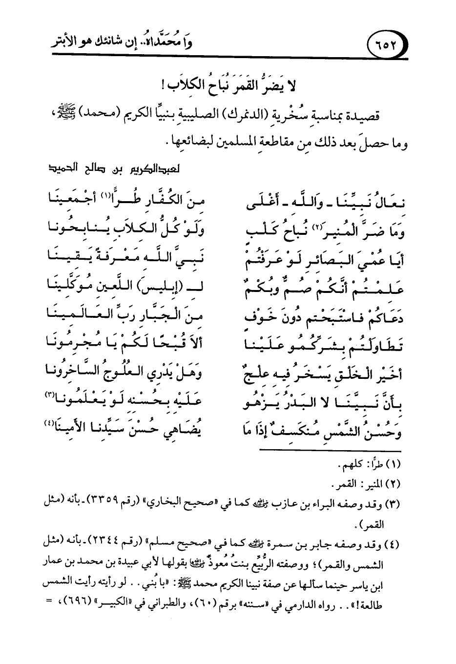 وَمَا ضَر المُنِيرَ (¬2) نُباحُ كلبٍ ... وَلَوْ كُل الكِلاَبِ يُنابِحُونا
