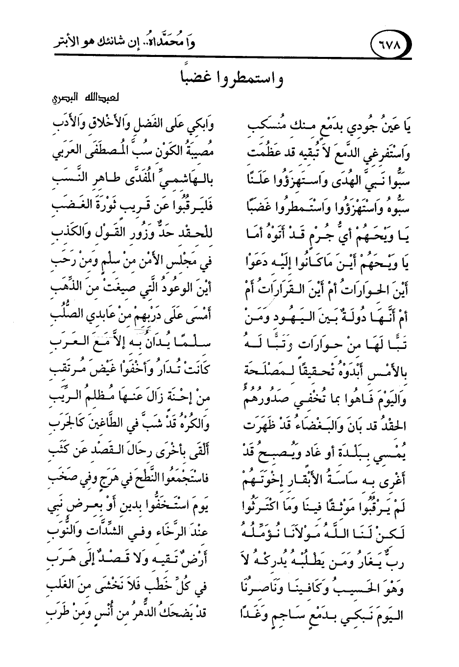 سَبُّوهُ وَاسْتَهْزَؤُوا وَاسْتَمطرُوا غَضبًا ... فَليَرقُبُوا عَن قَرِيب ثَوْرَةَ الغَضَبِ