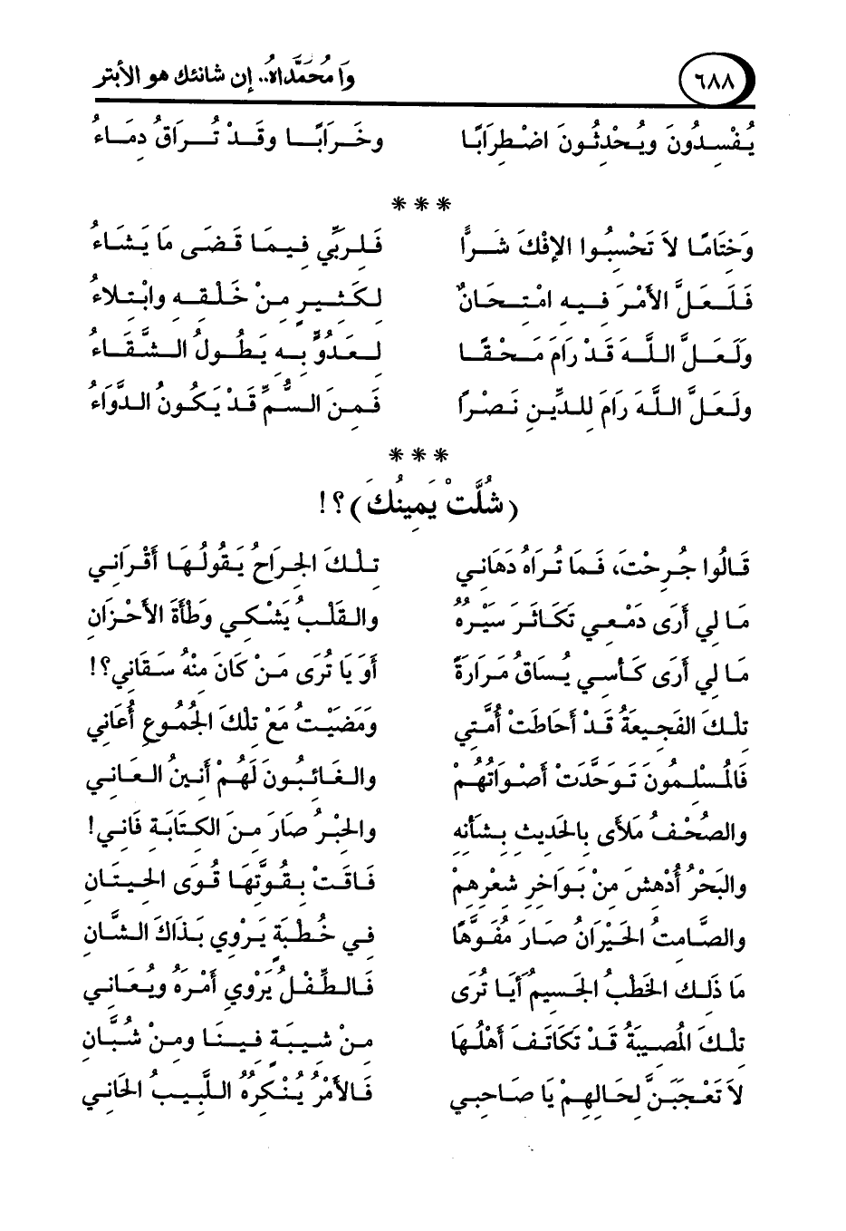 تِلكَ الفَجِيعَةُ قد أحَاطَتْ أمتِي ... وَمَضَيْتُ مَعْ تِلكَ الجُمُوع أُعَانِي