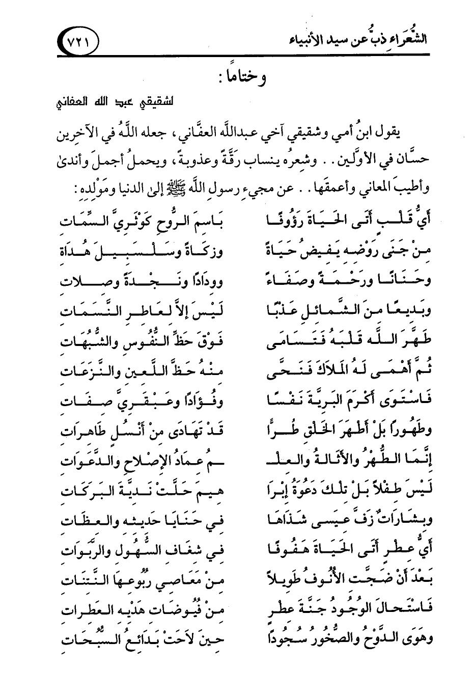 يقول ابنُ أمي وشقيقي أخي عبد الله العفاني، جعله الله في الآخِرين حسَّان في الأوَّلين .. وشِعره ينساب رَقَّةً وعذوبةً، ويحمل أجملَ وأندى وأطيبَ المعاني وأعمقَها .. عن مجيءِ رسولِ الله - صلى الله عليه وسلم - إلى الدنيا ومَوْلِدِهِ: