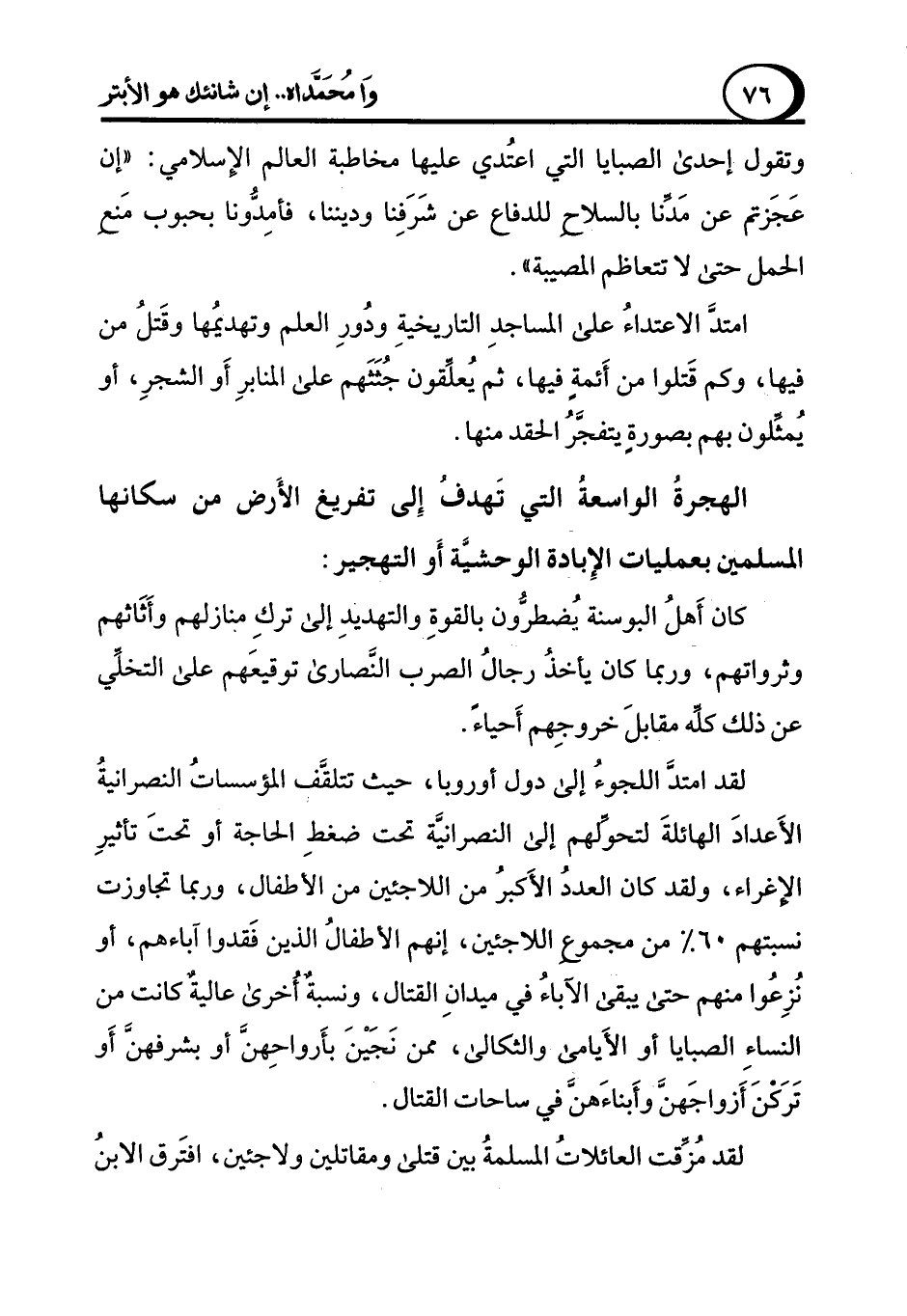 وتقول إحدى الصبايا التي اعتُدي عليها مخاطبة العالم الإسلامي: "إن عَجَزتم عن مَدِّنا بالسلاح للدفاع عن شَرَفِنا وديننا، فأمِدُّونا بحبوب مَنع الحمل حتى لا تتعاظم المصيبة".