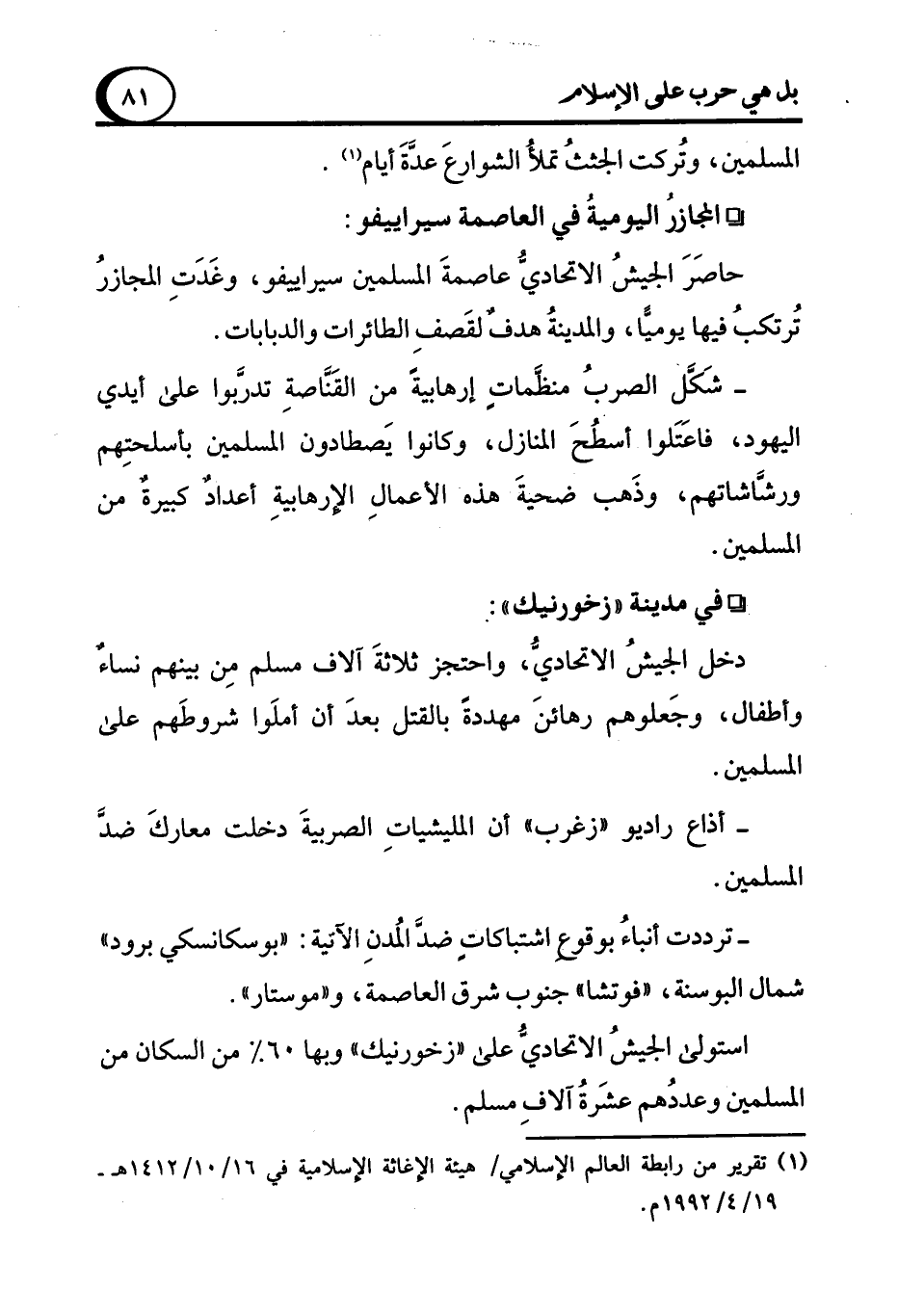 (¬1) تقرير من رابطة العالم الإسلامي/ هيئة الإغاثة الإسلامية في 16/ 10/ 1412 هـ- 19/ 4 / 1992 م.