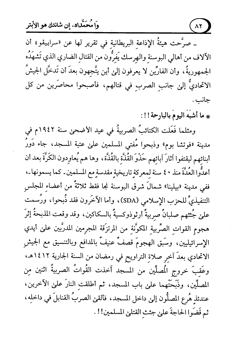 ومثلما فَعَلت الكتائبُ الصربيةُ في عيد الأضحى سنة 1942 م في مدينة "فوتشا يوم" وذبحوا مُفتي المسلمين على عتبة المسجد، جاء دَورُ أبنائِهم ليقتفوا آثارَ آبائِهم حَذْوَ القُذَّةِ بالقُذَّة، وها هم يُعاوِدون الكَرَّةَ بعد أن أعدُّوا العُدَّةَ منذ 40 سنة لِمعركةٍ تاريخيةٍ مقدسةٍ مع المسلمين -كما يسمونها-، ففي مدينة "بيلينا" شمالَ شرق البوسنة نجا فقط ثلاثة من أعضاءِ المجلسِ التنفيذيِّ للحزب الإِسلامي ( SDA) ، وأما الآخَرون فقد ذُبحوا، ورُسمت على جُثثهم صلبانٌ صِربيةٌ أرثوذوكسيةٌ بالسكاكين، وقد وقعت المذبحةُ إثرَ هجوم القواتِ الصِّربيةِ المكوَّنةِ من المرتزَقة المجرِمين المدربين على أيدي الإسرائيليين، وسَبق الهجومَ قصفٌ عنيفٌ بالمدافع وبالتنسيق مع الجيشِ الاتحادي بعدَ آخِرِ صلاةِ التراويح في رمضان من السنة الجارية 1412 هـ، وعَقِبَ خروج المُصلِّين من المسجد أَخذت القُواتُ الصربيةُ اثنين مِن المصلِّين، وذَبَحَتْهما على باب المسجد، ثم أطلقتِ النارَ على الآخرين، عندئذٍ هُرع المصلُّون إلى داخل المسجد، فألقى الصربُ القنابلَ في داخلِه، ثم قَضَوا الحاجةَ على جثثِ القتلى المسلمين!!.