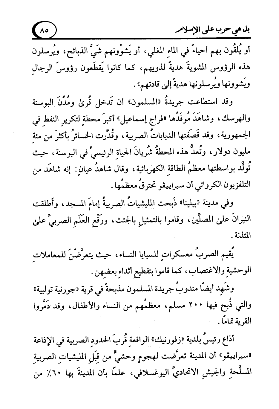 وقد استطاعت جريدةُ "المسلمون" أن تَدخل قُرى ومدُنَ البوسنة والهرسك، وشاهَدَ مُوفَدها "فراج إسماعيل" أكبرَ محطةٍ لتكريرِ النفطِ في الجمهورية، وقد قَصَفتها الدباباتُ الصربية، وقُدِّرت الخسائرُ بأكثرَ من مئةِ مليون دولار، وتُعدُّ هذه المحطةُ شُريانَ الحياةِ الرئيسيِّ في البوسنة، حيث تُولَّد بواسطتها معظمُ الطاقةِ الكهربائية، وقال شاهد عيانٍ: إنه شاهَد من التلفزيون الكرواتي أن سيراييفو تحترقُ معظمُها.