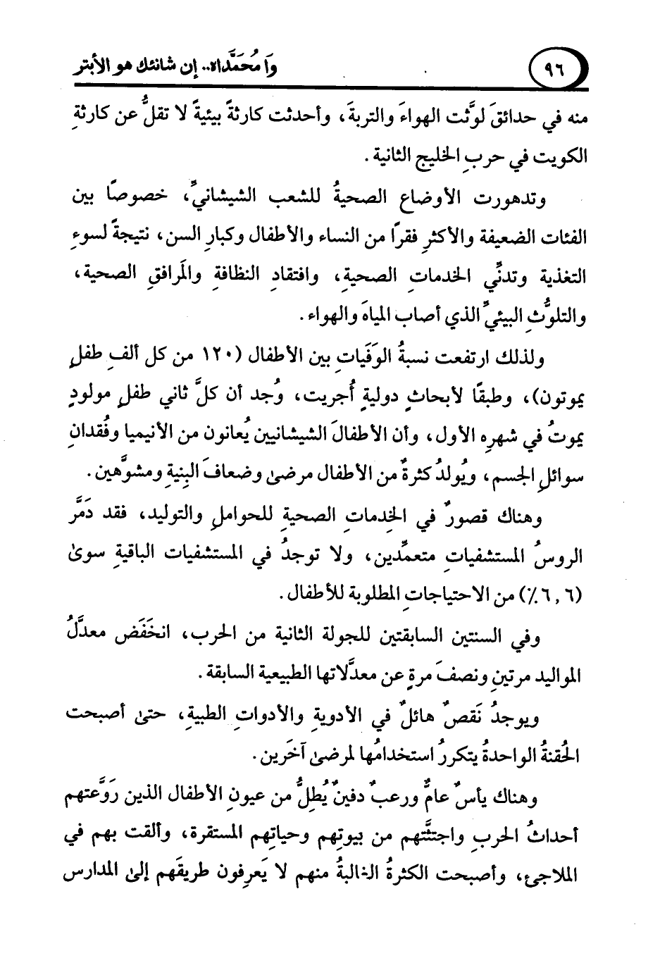 ولذلك ارتفعت نسبةُ الوَفَياتِ بين الأطفال (120 من كل ألفِ طفل يموتون)، وطبقًا لأبحاثِ دوليةٍ أُجريت، وُجد أن كل ثاني طفل مولودٍ يموتُ في شهرِه الأول، وأن الأطفالَ الشيشانيين يُعانون من الأنيميا وفُقدانِ سوائل الجسم، وُيولدُ كثرةٌ من الأطفالَ مرضى وضعافَ البِنيةِ ومشوَّهين.
