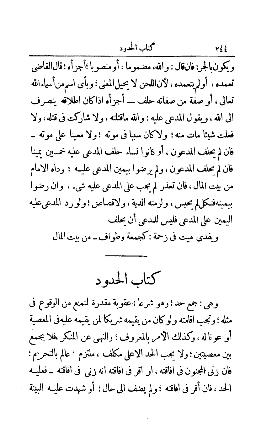وهي: جمع حد وهو شرعا: عقوبة مقدرة لتمنع من الوقوع في مثله وتجب إقامته ولو كان من يقيمه شريكا لمن يقيمه عليه في المعصية أو عونا له وكذلك الأمر بالمعروف والنهي عن المنكر فلا يجمع بين معصيتين ولا يجب الحد إلا على مكلف ملتزم عالم بالتحريم فإن زنى المجنون في إفاقته أو أقر في إفاقته أنه زنى في إفاقته - فعليه الحد فإن أقر في إفاقته ولم يضف إلى حال أو شهدت عليه البينة