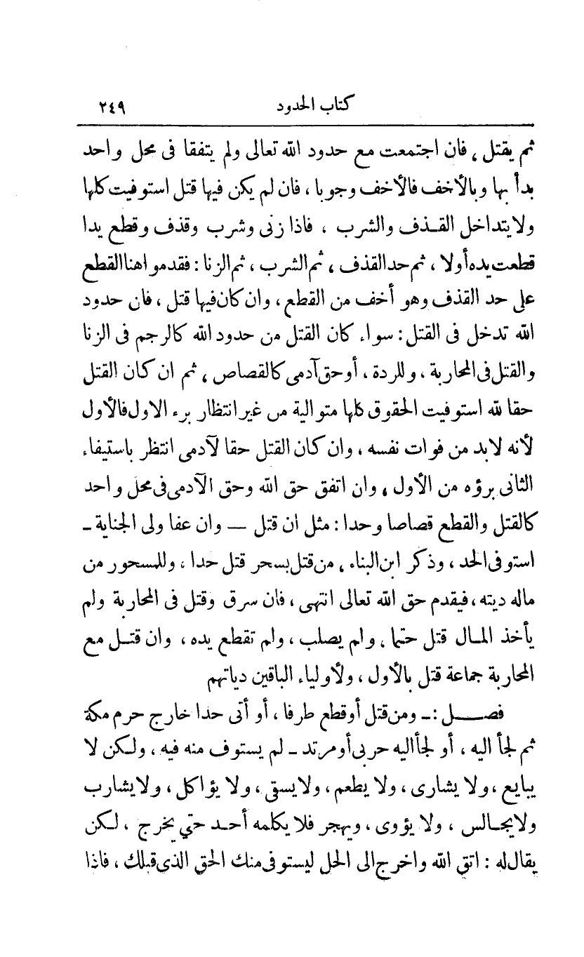 ثم يقتل، فإن اجتمعت مع حدود الله تعالى ولم يتفقا في محل واحد بدأ بها وبالأخف فالأخف وجوبا فإن لم يكن فيها قتل استوفيت كلها ولا يتداخل القذف والشرب فإذا زنى وشرب وقذف وقطع يدا قطعت يده أولا ثم حد القذف ثم الشرب ثم الزنا: فقدموا هنا القطع على حد القذف وهو أخف من القطع وإن كان فيها قتل فإن حدود الله تدخل في القتل: سواء كان القتل من حدود الله كالرجم في الزنا والقتل في المحاربة وللردة أو حق آدمي كالقصاص ثم إن كان القتل حقا لله استوفيت الحقوق كلها متوالية من غير انتظار برء الأول فالأول لأنه لا بد من فوات الأول وإن اتفق حق الله وحق الآدمي في محل واحد كالقتل والقطع قصاصا واحدا: مثل أن قتل - وإن عفا ولي الجناية - استوفى الحد وذكر ابن البناء من قتل بسحر قتل حدا وللمسحور من ماله ديته فيقدم حق الله تعالى انتهى فإن سرق وقتل في المحاربة ولم يأخذ المال قتل حتما ولم يصلب ولم تقطع يده وإن قتل مع المحاربة جماعة قتل بالأول ولأولياء الباقين دياتهم.