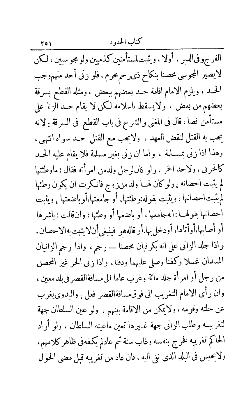 الفرج وفي الدبر أولا ويثبت لمستأمنين كذميين ولو مجوسيين لكن لا يصير المجوسي محصنا بنكاح ذي رحم محرم فلو زنى أحد منهم وجب الحد ويلزم الإمام إقامة حد بعضهم ببعض ومثله القطع بسرقة بعضهم من بعض ولا يسقط بإسلامه لكن لا يقام حد الزنا على مستأمن نصا قال في المغني والشرح الكبير في باب القطع في السرقة: لأنه يجب به القتل لنقض العهد ولا يجب مع القتل حد سواه انتهى وهذا إذا زنى بمسلمة وأما إن زنى بغير مسلمة فلا يقام عليه الحد كالحربي ولا حد الخمر ولو كان لرجل ولد من امرأته فقال: ما وطئتها لم يثبت إحصانه ولو كان لها ولد من زوج فأنكرت أن يكون وطئها لم يثبت إحصانها ويثبت بقوله: وطئتها أو جامعتها أو باضعتها ويثبت إحصانها بقولها: أنه جامعها أو باضعها أو وطئها وإن قالت: باشرها أو أصابها أو أتاها أو دخل بها أو قاله هو فينبغي أن لا يثبت به الإحصان وإذا جلد الزاني على أنه بكر فبان محصنا - رجم وإذا رجم الزانيان المسلمان غسلا وكفنا وصلى عليهما ودفنا وإذا زنى الحر غير المحصن من رجل أو امرأة جلد مائة وغرب عاما إلى مسافة القصر في بلد معين وإن رأى الإمام التغريب إلى فوق مسافة القصر فعل والبدوي يغرب عن حلته وقومه ولا يمكن من الإقامة بينهم ولو عين السلطان جهة لتغريبه وطلب الزاني جهة غيرها تعين ما عينه السلطان ولو أراد الحاكم تغريبه فخرج بنفسه وغاب سنة ثم عاد لم يكفه في ظاهر كلامهم ولا يحبس في البلد نفي إليه فإن عاد من تغريبه قبل مضي الحول