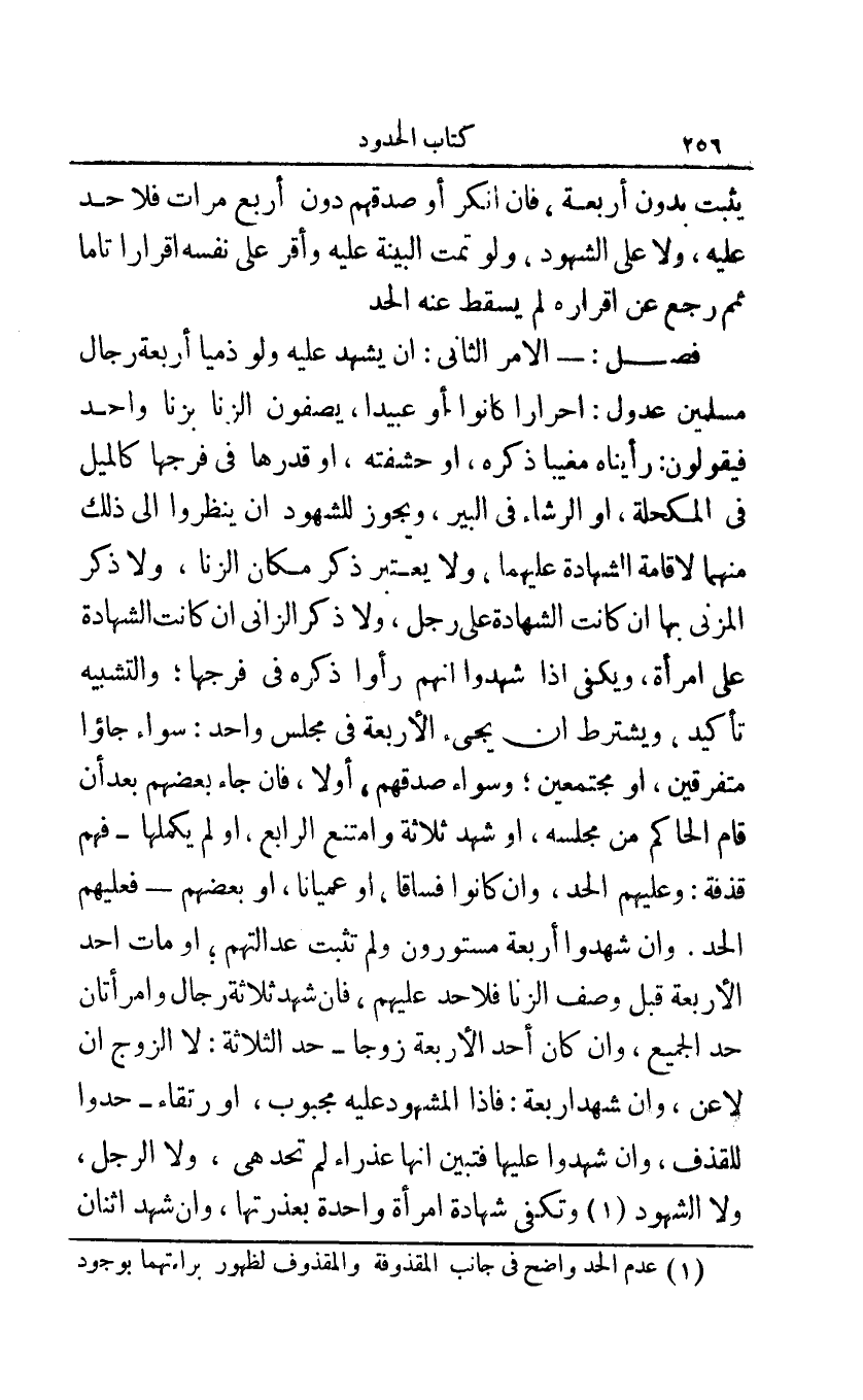 فصل: - الأمر الثاني: أن يشهد عليه ولو ذميا أربعة رجال مسلمين عدول: أحرار كانوا أو عبيدا يصفون الزنا بزنا واحد فيقولون: رأيناه مغيبا ذكره أو حشفته أو قدرها في فرجها كالميل في المكحلة أو الرشاء في البير ويجوز للشهود أن ينظروا إلى ذلك منهما لإقامة الشهادة عليهما ولا يعتبر ذكر مكان الزنا ولا ذكر المزني بها إن كانت الشهادة على رجل ولا ذكر الزاني إن كانت الشهادة على امرأة ويكفي إذا شهدوا أنهم رأوا ذكره في فرجها والتشبيه تأكيد ويشترط أن يجئ الأربعة في مجلس واحد: سواء جاؤا متفرقين أو مجتمعين وسواء صدقهم أو لا فإن جاء بعضهم بعد أن قام الحاكم من مجلسه أو شهد ثلاثة وامتنع الرابع أو لم يكملها - فهم قذفة: وعليهم الحد وإن كانوا فساقا أو عميانا أو بعضهم - فعليهم الحد وإن شهدوا أربعة مستورون ولم تثبت عدالتهم أو مات أحد الأربعة قبل وصف الزنا فلا حد عليهم فإن شهد ثلاثة رجال وامرأتان حد الجميع وإن كان أحد الأربعة زوجا - حد الثلاثة: لا الزوج إن لاعن وإن شهدوا أربعة: فإذا المشهود عليه مجبوب أو رتقاء - حدوا للقذف وإن شهدوا عليها فتبين أنها عذراء لم تحد هي ولا الرجل ولا الشهود1 وتكفي شهادة امرأة واحدة بعذرتها وإن شهد اثنان
