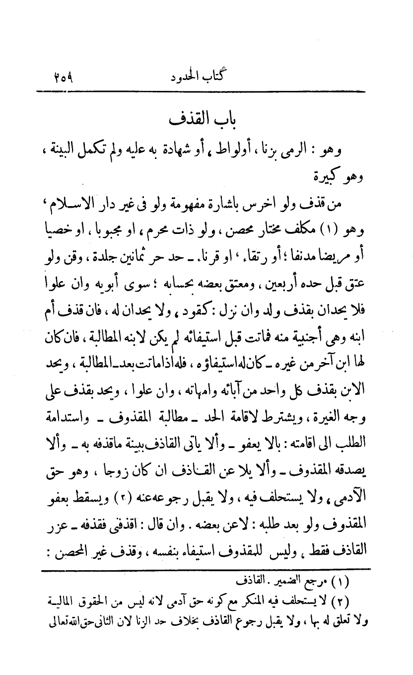 من قذف ولو أخرس بإشارة مفهومة ولو في غير دار الإسلام، وهو1 مكلف مختار محصن ولو ذات محرم أو مجبوبا أو خصيا أو مريضا مدنفا أو رتقاء أو قرناء - حد حر ثمانين جلدة وقن ولو عتق قبل حده أربعين ومعتق بعضه بحسابه سوى أبويه وإن علوا فلا يحدان بقذف ولد وإن نزل: كقود ولا يحدان له فإن قذف أم ابنه وهي أجنبية منه فماتت قبل استيفاؤه فله إذا ماتت بعد - المطالبة ويحد الابن بقذف كل واحد من آبائه وأمهاته وإن علوا ويحد بقذف على وجه الغيرة ويشترط لإقامة الحد - مطالبة المقذوف - واستدامة الطلب إلى إقامته: بألا يعفو - وألا يأتي القاذف ببينة ما قذفه به - وألا يصدقه المقذوف - وألا يلا عن القاذف إن كان زوجا وهو حق الآدمي ولا يستحلف فيه ولا يقبل رجوعه عنه2 ويسقط بعفو المقذوف فقط وليس للمقذوف استيفاء بنفسه وقذف غير المحصن: