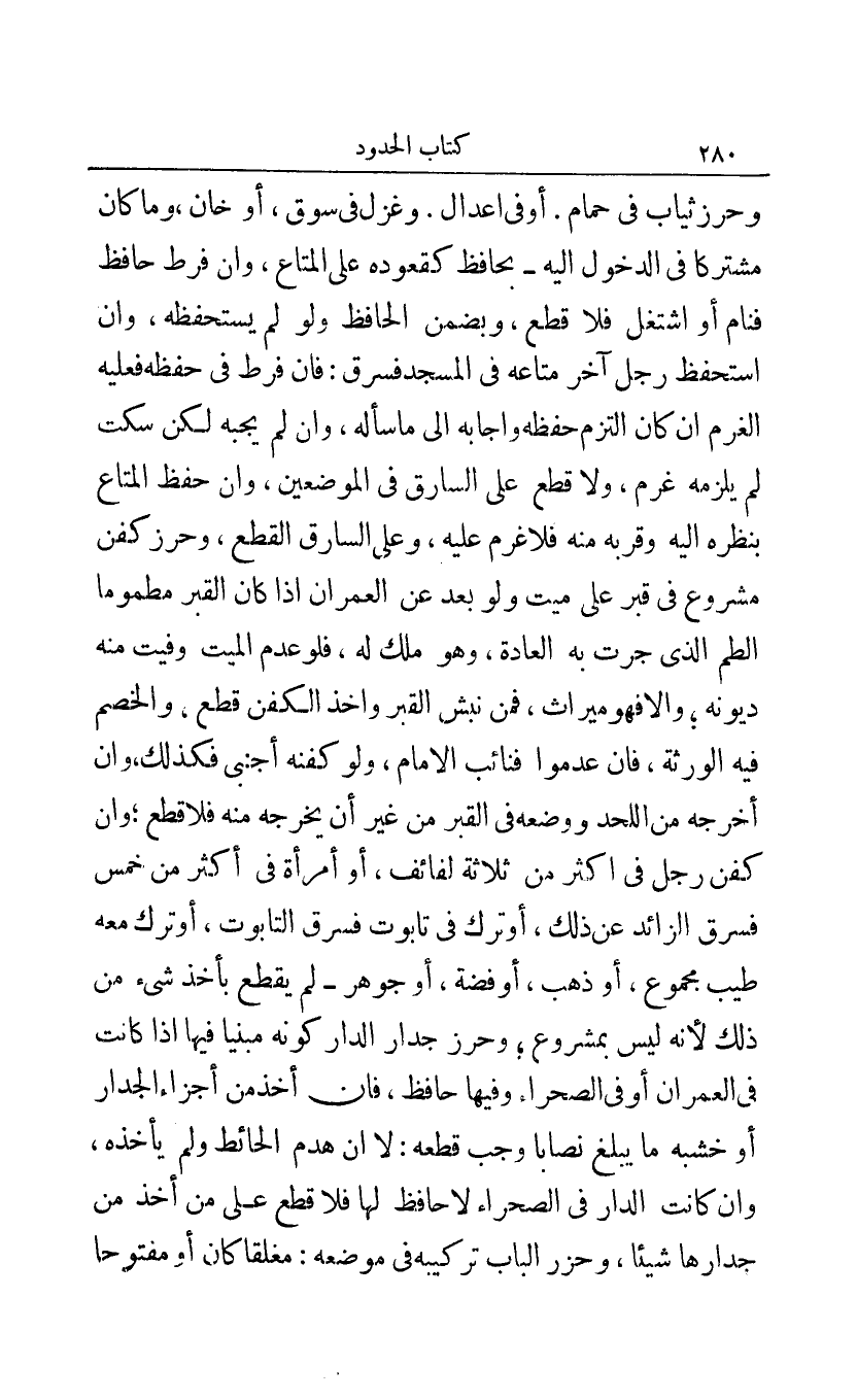 وحرز ثياب في حمام أو في إعدال وغزل في سوق أو خان وما كان مشتركا في الدخول إليه - بحافظ كقعوده على المتاع وإن فرط حافظ فنام أو اشتغل فلا قطع ويضمن الحافظ ولو لم يستحفظه وإن استحفظ رجل آخر متاعه في المسجد فسرق: فإن فرط في حفظه فعليه الغرم إن كان التزم حفظه وأجابه إلى ما سأله وإن لم يجبه لكن سكت لم يلزمه غرم ولا قطع على السارق في الموضعين وإن حفظ المتاع بنظره إليه وقربه منه فلا غرم عليه وعلى السارق القطع وحرز كفن مشروع في قبر على ميت ولو بعد عن العمران إذا كان القبر مطموما الطم الذي جرت به العادة وهو ملك له فلو عدم الميت وفيت منه ديونه وإلا فهو ميراث فمن نبش القبر وأخذ الكفن قطع والخصم فيه الورثة فإن عدموا فنائب الإمام ولو كفنه أجنبي فكذلك وإن أخرجه من اللحد ووضعه في القبر من غير أن يخرجه منه فلا قطع وإن كفن رجل في أكثر من ثلاثة لفائف أو امرأة في أكثر من خمس فسرق الزائد عن ذلك أو ترك في تابوت فسرق التابوت أو ترك معه طيب مجموع أو ذهب أو فضة أو جوهر - لم يقطع بأخذ شيء من ذلك لأنه ليس بمشروع وحرز جدار الدار كونه مبنيا فيها إذا كانت في العمران أو في الصحراء وفيها حافظ فإن أخذ من أجزاء الجدار أو خشبة ما يبلغ نصابا وجب قطعه: لا إن هدم الحائط ولم يأخذه وإن كانت الدار في الصحراء لا حافظ لها فلا قطع على من أخذ من جدارها شيئا وحرز الباب تركيبه في موضعه: مغلقا كان أو مفتوحا