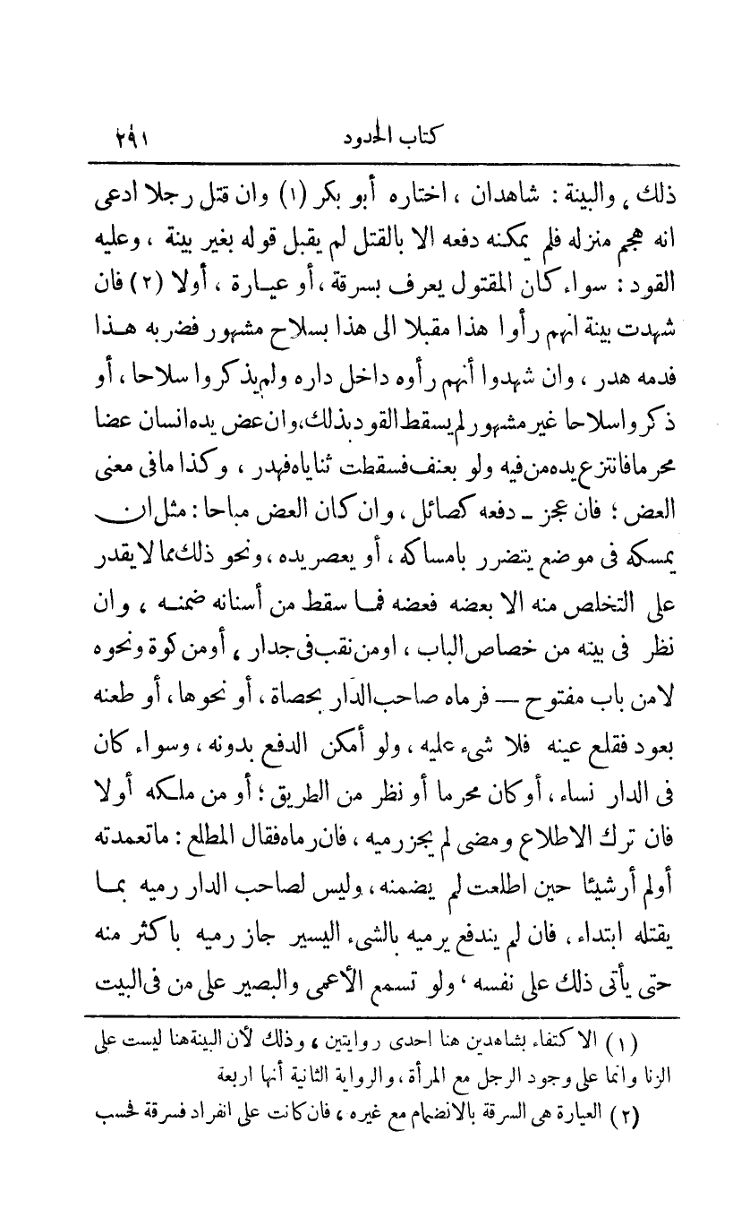 ذلك والبينة: شاهدان اختاره أبو بكر1 وإن قتل رجلا ادعى أنه هجم منزله فلم يمكنه دفعه إلا بالقتل لم يقبل قوله بغير بينة وعليه القود: سواء كان المقتول يعرف بسرقة أو عيارة، أولا2 فإن شهدت بينة أنهم رأوا هذا مقبلا إلى هذا بسلاح مشهور فضربه هذا فدمه هدر وإن شهدوا أنهم رأوه داخل داره ولم يذكروا سلاحا أو ذكروا سلاحا غير مشهور لم يسقط القود بذلك وإن عض يده إنسان عضا محرما فانتزع يده من فيه ولو بعنف فسقطت ثناياه فهدر وكذا ما في معنى العض فإن عجز - دفعه كصائل وإن كان العض مباحا: مثل أن يمسكه في موضع يتضرر بإمساكه أو يعصر يده ونحو ذلك مما لا يقدر على التخلص منه إلا بعضه فعضه فما سقط من أسنانه ضمنه وإن نظر في بيته من خصاص الباب أو من نقبب في جدار أو من كوة ونحوه لا من باب مفتوح - فرماه صاحب الدار بحصاة أونحوها أو طعنه بعود فقلع عينه فلا شيء عليه ولو أمكن الدفع بدونه وسواء كان في الدار نساء أو كان محرما أو نظر من الطريق أو من ملكه أولا فإن ترك الاطلاع ومضى لم يجز رميه فإن رماه فقال المطلع: ما تعمدته أو لم أر شيئا حين اطلعت لم يضمنه وليس لصاحب الدار رميه بما يقتله ابتداء فإن لم يندفع يرميه بالشيء اليسير جاز رميه بأكثر منه حتى يأتي ذلك على نفسه ولو تسمع الأعمى والبصير على من في البيت