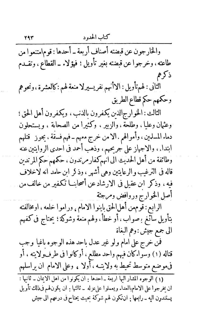 1 الوجوه المشار إليها أربعة – أحدها: أن يكونوا من أهل الإيمان – ثانيها: أن يخرجوا على الإمام بالعداء ويعملوا على عزله – ثالثها: أن يكون لهم في ذلك تأويل يستندون إليه – رابعها: أن تكون لهم شوكة بحيث يحتاج في ردعهم إلى جيش.