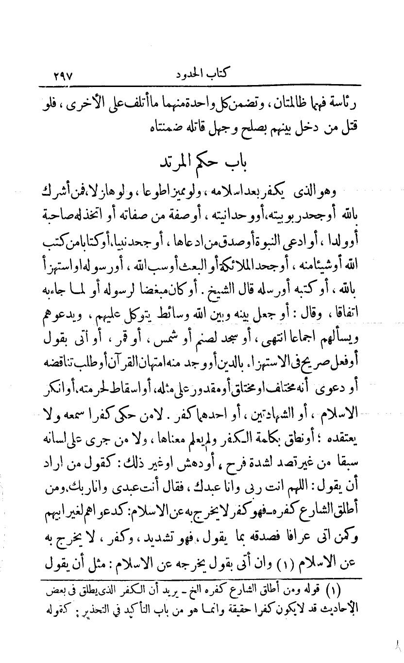 وهو الذي يكفر بعد إسلامه ولو مميزا طوعا ولو هازلا فمن أشرك بالله أو جحد ربوبيته أو وحدانيته أو صفة من صفاته أو اتخذ له صاحبة أو ولدا أو ادعى النبوة أو صدق من ادعاها أو جحد نبيا أو كتابا من كتب الله أو شيئا منه أو جحد الملائكة أو البعث أو سب الله أو رسوله أو استهزأ بالله أو كتبه أو رسله قال الشيخ: أو كان مبغضا لرسوله أو لما جاء به اتفاقا وقال: أو جعل بينه وبين الله وسائط يتوكل عليهم ويدعوهم ويسألهم إجماعا انتهى أو سجد لصنم أو شمس أو قمر أو أتى بقول أو فعل صريح في الاستهزاء بالدين أو وجد منه امتهان القرآن أو طلب تناقضه أو دعوى أنه مختلف أو مختلق أو مقدور على مثله أو إسقاط لحرمته أو أنكر الإسلام أو الشهادتين أو أحدهما كفر لا من حكى كفرا سمعه ولا يعتقده أو نطق بكلمة الكفر ولم يعلم معناها ولا من جرى على لسانه سبقا من غير قصد لشدة فرح أو دهش أو غير ذلك: كقول من أراد أن يقول: اللهم أنت ربي وأنا عبدك فقال: أنت عبدي وأنا ربك ومن أطلق الشارع كفر - فهو كفر لا يخرج به عن الإسلام: كدعواهم لغير أبيهم وكمن أتى عرافا فصدقه بما يقول فهو تشديد وكفر لا يخرج به عن الإسلام وإن أتى بقول يخرجه عن الإسلام1: مثل أن يقول