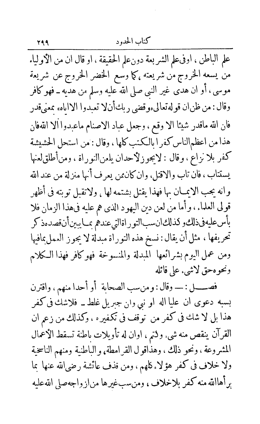 علم الباطن أو في علم الشريعة دون علم الحقيقة أو قال أن من الأولياء من يسعه الخروج من شريعته كما وسع الخضر الخروج عن شريعة موسى أو إن هدى غير النبي صلى الله عليه وسلم من هديه - فهو كافر وقال: من ظن أن قوله تعالى: {وَقَضَى رَبُّكَ أَلَّا تَعْبُدُوا إِلَّا إِيَّاهُ} بمعنى قدر فإن الله ما قدر شيئا إلا وقع وجعل عباد الأصنام ما عبدوا إلا الله فإن هذا من أعظم الناس كفرا بالكتب كلها وقال: من استحل الحشيشة كفر بلا نزاع وقال: لا يجوز لأحد أن يلعن التوراة ومن أطلق لعنها يستتاب فإن تاب وإلا قتل وإن كان ممن يعرف أنها منزلة من عند الله وأنه يجب الإيمان بها فهذا يقتل بشتمه لها ولا تقبل توبته في أظهر قولي العلماء وأما من لعن دين اليهود الذي هم عليه في هذا الزمان فلا بأس عليه في ذلك وكذلك إن سب التوراة التي عندهم بما يبين أن قصده ذكر تحريفها مثل أن يقال: نسخ هذه التوراة مبدلة لا يجوز العمل بما فيها ومن عمل اليوم بشرائعها المبدلة والمنسوخة فهو كافر فهذا الكلام ونحوه حق لا شيء على قائله.