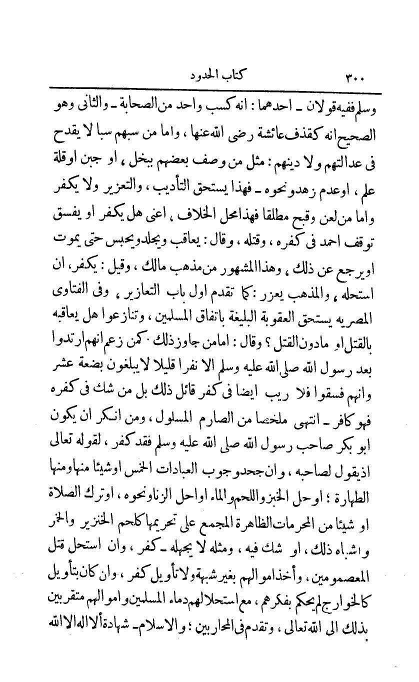 وسلم ففيه قولان - أحدهما: أنه كسب واحد من الصحابة - والثاني وهو الصحيح أنه كقذف عائشة رضي الله عنها وأما من سبهم سبا لا يقدح في عدالتهم ولا دينهم: مثل من وصف بعضهم ببخل أو جبن أو قلة علم أو عدم زهد ونحوه - فهذا يستحق التأديب والتعزير ولا يكفر وأما من لعن وقبح مطلقا فهذا محل الخلاف أعني هل يكفر أو يفسق توقف أحمد في كفره وقتله وقال: يعاقب ويجلد ويحبس حتى يموت أو يرجع عن ذلك وهذا المشهور من مذهب مالك وقيل: يكفر إن استحله والمذهب يعزر: كما تقدم أول باب التعازير وفي الفتاوى المصرية يستحق العقوبة البليغة باتفاق المسلمين وتنازعوا هل يعاقبه بالقتل أو ما دون القتل؟ وقال: أما من جاوز ذلك كمن زعم أنهم ارتدوا بعد رسول الله صلى الله عليه وسلم إلا نفرا قليلا لا يبلغون بضعة عشر وأنهم فسقوا فلا ريب أيضا في كفر قائل ذلك بل من شك في كفره فهو كافر - انتهى ملخصا من الصارم المسلول ومن أنكر أن يكون أبو بكر صاحب رسول الله صلى الله عليه وسلم فقد كفر لقوله تعالى: {إِذْ يَقُولُ لِصَاحِبِهِ} وإن جحد وجوب العبادات الخمس أو شيئا منها ومنها الطهارة أو حل الخبز واللحم والماء أو أحل الزنا ونحوه أو ترك الصلاة أو شيئا من المحرمات الظاهرة المجمع على تحريمها كلحم الخنزير والخمر وأشباه ذلك أو شك فيه ومثله ل يجهله - كفر وإن كان بتأويل كالخوارج لم يحكم بكفرهم مع استحلالهم دماء المسلمين وأموالهم متقربين بذلك إلى الله تعالى وتقدم في المحاربين والإسلام - شهادة ألا إله إلا الله