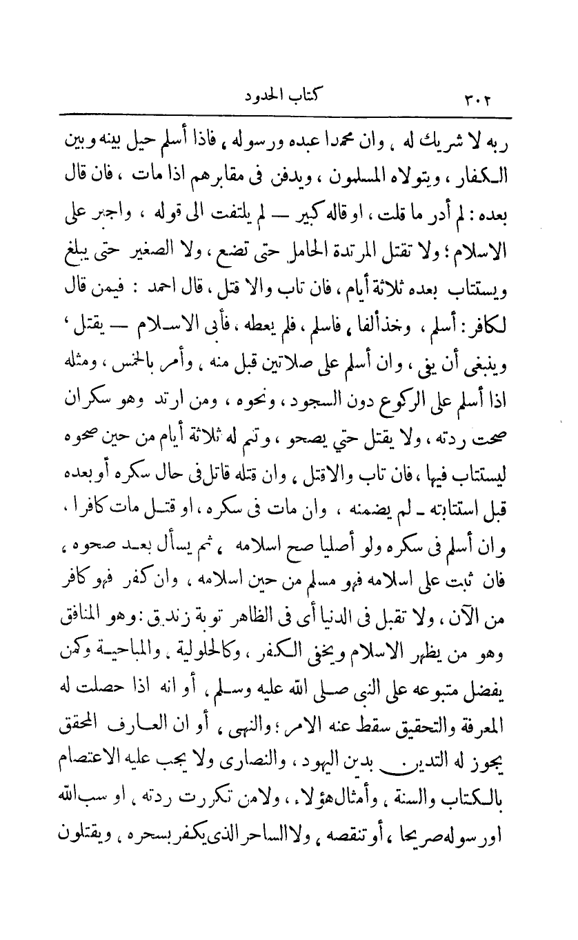 ربه لا شريك له وأن محمد عبده ورسوله فإذا اسلم حيل بينه وبين الكفار ويتولاه المسلمون ويدفن في مقابرهم إذا مات فإن قال بعده: لم أدر ما قلت أو قاله كبير - لم يلتفت إلى قوله وأجبر على الإسلام ولا تقتل المرتدة الحامل حتى تضع ولا الصغير حتى يبلغ ويستتاب بعده ثلاثة أيام فإن تاب وإلا قتل قال أحمد: فيمن قال لكافر: أسلم وخذ ألفا فأسلم فلم يعطه فأبى الإسلام - يقتل وينبغي أن يفي وإن أسلم على صلاتين قبل منه وأمر بالخمس ومثله إذا أسلم على الركوع دون السجود ونحوه ومن ارتد وهو سكران صحت ردته ولا يقتل حتى يصحو وتتم له ثلاثة أيام من حين صحوه ليستتاب فيها فإن تاب وإلا قتل وإن مات في سكره أو قتل مات كافرا وإن أسلم في سكره ولو أصليا صح إسلامه ثم يسأل بعد صحوه فإن ثبت على إسلامه فهو مسلم من حين إسلامه وإن كفر فهو كافر من الآن ولا تقبل في الدنيا أي في الظاهر توبة زنديق: وهو المنافق وهو من يظهر الإسلام ويخفي الكفر وكالحلولية والمباحية وكمن يفضل متبوعه على النبي صلى الله عليه وسلم أو أنه إذا حصلت له المعرفة والتحقيق سقط عنه الأمر والنهي أو إن العارف المحقق يجوز له التدين بدين اليهود والنصارى ولا يجب عليه الاعتصام بالكتاب والسنة وأمثال هؤلاء ولا من تكررت ردته أو سب الله أو رسوله صريحا أو تنقصه ولا الساحر الذي يكفر بسحره ويقتلون