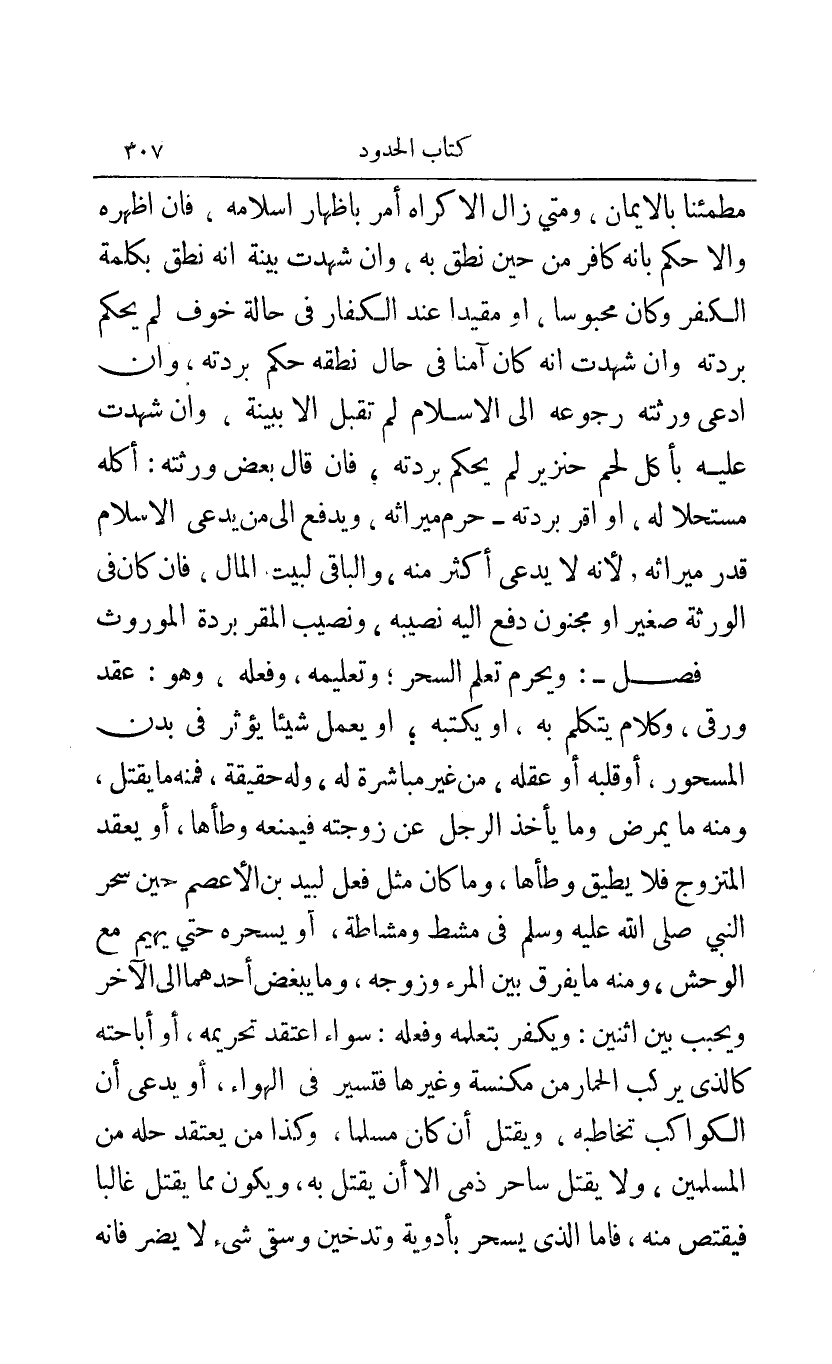 عقد ورقي وكلام يتكلم به أو يكتبه أو يعمل شيئا يؤثر في بدن المسحور أو قبله أو عقله من غير مباشرة له وله حقيقة فمنه ما يقتل ومنه ما يمرض وما يأخذ الرجل عن زوجته فيمنعه وطأها أو يعقد المتزوج فلا يطيق وطأها وما كان مثل فعل لبيد بن الأعصم حين سحر النبي صلى الله عليه وسلم في مشط ومشاطة أو يسحره حتى يهيم مع الوحش ومنه ما يفرق بين المرء وزوجه وما يبغض أحدهما إلى الآخر ويحبب بين الاثنين: ويكفر بتعلمه وفعله: سواء اعتقد تحريمه أو إباحته كالذي يركب الحمار من مكنسة وغيرها فتسير في الهواء أو يدعي أن الكواكب تخاطبه ويقتل إن كان مسلما وكذا من يعتقد حله من المسلمين ولا يقتل ساحر ذمي إلا أن يقتل به ويكون مما يقتل غالبا فيقتص منه فأما الذي يسحر بأدوية وتدخين وسقي شيء لا يضر فإنه