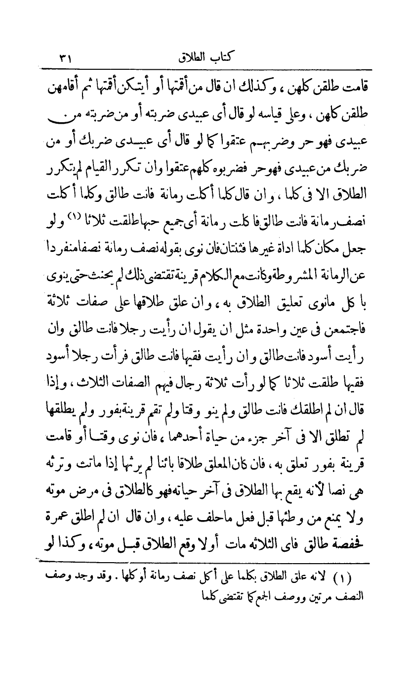 قامت طلقن كلهن، وكذلك إن قال من أقمتها أو أيتكن أقمتها ثم أقامهن طلقن كلهن وعلى قياسه لو قال أي عبيدي ضربته أو من ضربته من عبيدي فهو حر وضربهم عتقوا كما لو قال أي عبيدي ضربك أو من ضربك من عبيدي فهو حر فضربوه كلهم عتقوا وإن تكرر القيام لم يتكرر الطلاق إلا في كلما وإن قال كلما أكلت رمانة فأنت طالق وكلما أكلت نصف رمانة فأنت طالق فأكلت رمانة أي جميع حبها طلقت ثلاثا1 ولو جعل مكان كلما أداة غيرها فثنتان فإن نوى بقوله نصف رمانة نصفا منفردا عن الرمانة المشروطة وكانت مع الكلام قرينة تقتضي ذلك لم يحنث حتى ينوي بأكل ما نوى تعليق الطلاق به وإن علق طلاقها على صفات ثلاثة فاجتمعن في عين واحدة مثل إن يقول إن رأيت رجلا فأنت طالق وإن رأيت أسود فأنت طالق وإن رأيت فقيها فأنت طالق فرأت رجلا أسود فقيها طلقت ثلاثا كما لو رأت ثلاثة رجال فيهما الصفات الثلاث وإذا قال إن لم أطلقك فأنت طالق ولم ينو وقتا ولم تقم قرينة بفور ولم يطلقها لم تطلق إلا في آخر جزء من حياة أحدهما فإن نوى وقتا أو قامت قرية بفور تعلق به فإن كان المعلق طلاقا بائنا لم يرثها إذا ماتت وترثه هي نصا لأنه يقع بها الطلاق في آخر حياته فهو كالطلاق في مرض موته ولا يمنع من وطئها قبل فعل ما حلف عليه وإن قال إن لم أطلق عمرة فحفصة طالق فأن الثلاثة مات أولا وقع الطلاق قبل موته وكذا لو