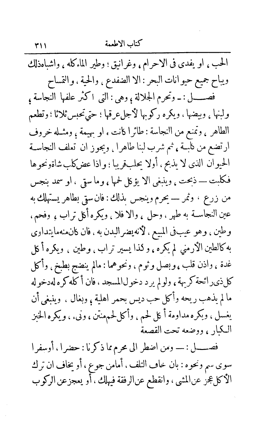التي أكثر علفها النجاسة ولبنها وبيضها ويكره ركوبها لأجل عرقها حتى تحبس ثلاثا وتطعم الطاهر وتمنع من النجاسة: طائرا كانت أو بهيمة ومثله خروف ارتضع من كلبة ثم شرب لبنا طاهرا ويجوز أن تعلف النجاسة الحيوان الذي لا يذبح أو لا يحلب قريبا وإذا عض كلب شاة ونحوها فكلبت - ذبحت وينبغي ألا يؤكل لحمها وما سقى بطاهر يستهلك به عين النجاسة به طهر وحل وإلا فلا ويكره أكل تراب وفحم وطين وهو عيب في المبيع لأنه يضر البدن به فإن كان منه ما يتداوى به كالطين الأرمني لم يكره وكذا يسير تراب وطين ويكره أكل غدة وأذن قلب وبصل وثوم ونحوهما: ما لم ينضج بطبخ وأكل كل ذي رائحة كريهة ولو لم يرد دخول المسجد فإن أكله كره له دخوله ما لم يذهب ريحه وأكل حب ديس بحمر أهلية وبغال وينبغي أن يغسل ويكره مداومة أكل لحم وأكل لحم منتن ونيء ويكره الخبز الكبار ووضعه تحت القصعة.