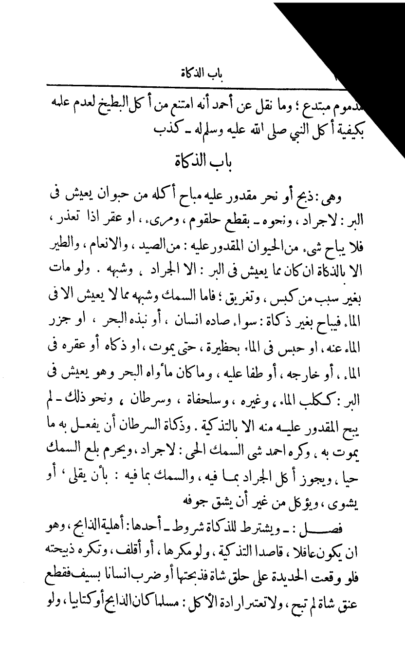 وهي: ذبح أو نحر مقدور عليه مباح أكله من حيوان يعيش في البر: لا جراد ونحوه - بقطع حلقوم ومريء أو عقر إذا تعذر فلا يباح شيء من الحيوان المقدور عليه: من الصيد والأنعام والطير إلا بالذكاة إن كان مما يعيش في البر: إلا الجراد وشبهه ولو مات بغير سبب من كبس وتغريق فأما السمك وشبهه مما لا يعيش إلا في الماء فيباح بغير ذكاة: سواء صاده إنسان أو نبذه البحر أو جزر الماء عنه أو حبس في الماء بحظيرة حتى يموت أو ذكاة أو عقره في الماء أو خارجه أو طفا عليه وما كان مأواه البحر وهو يعيش في البر: ككلب الماء وغيره وسلحفاة وسرطان ونحو ذلك - لم يبح المقدور عليه منه إلا بالتذكية وذكاة السرطان أن يفعل به ما يموت به وكره أحمد شيء من السمك الحي: لا جراد ويحرم بلغ السمك حيا ويجوز أكل الجراد بما فيه والسمك بما فيه: بأن يقلى أو يشوى ويؤكل من غير أن يشق جوفه.