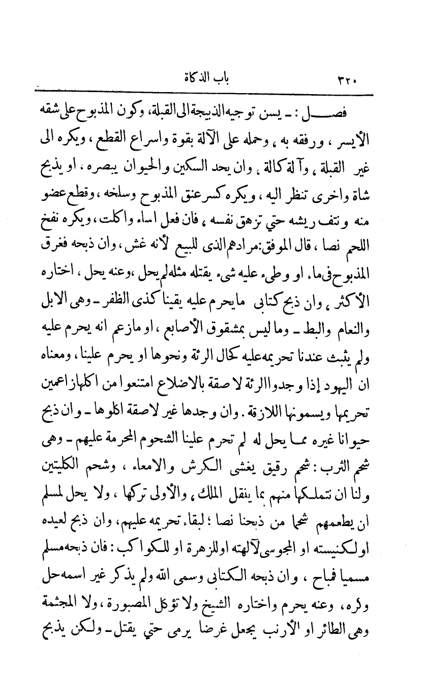 وكون المذبوح على شقه الأيسر ورفقه به وحمله على الآلة بقوة وإسراع القطع ويكره إلى غير القبلة وآلة كالة وأن يحد السكين والحيوان يبصره أو يذبح شاة وأخرى تنظر إليه ويكره كسر عنق المذبوح وسلخه وقطع عضو منه ونتف ريشه حتى تزهق نفسه فإن فعل أساء وأكلت ويكره نفخ اللحم نصا قال الموفق: مرادهم الذي للبيع لأنه غش وإن ذبحه فغرق المذبوح في ماء أو وطئ عليه شيء يقتله مثله لم يحل وعنه يحل اختاره الأكثر وإن ذبح كتابي ما يحرم عليه يقينا كذي الظفر - وهي الإبل والنعام والبط - وما ليس بمشقوق الأصابع أو ما زعم أنه يحرم عليه ولم يثبت عندنا تحريمه عليه كحال الرئة ونحوها أو يحرم علينا ومعناه أن اليهود إذا وجدوا الرئة لاصقة بالأضلاع امتنعوا من أكلها زاعمين تحريمها ويسمونها اللازقة وإن وجدها غير لاصقة أكلوها - وإن ذبح حيوانا غيره ما يحل له لم تحرم علينا الشحوم المحرمة عليهم - وهي شحم الثرب: شحم رقيق يغشى الكرش والأمعاء وشحم الكليتين ولنا أن نتملكها منهم بما ينقل الملك والأولى تركها ولا يحل لمسلم أن يطعمهم شحما من ذبحنا نصا لبقاء تحريمه عليهم وإن ذبح لعيده أو لكنيسته أو المجوسي لآلهته أو للزهرة أو للكواكب: فإن ذبحه مسلم مسميا فمباح وإن ذبحه الكتابي وسمى الله ولم يذكر غير اسمه حل وكره وعنه يحرم واختاره الشيخ ولا تؤكل المصبورة ولا المجثمة وهي الطائر أو الأرنب بجعل غرضا يرمى حتى يقتل - ولكن يذبح
