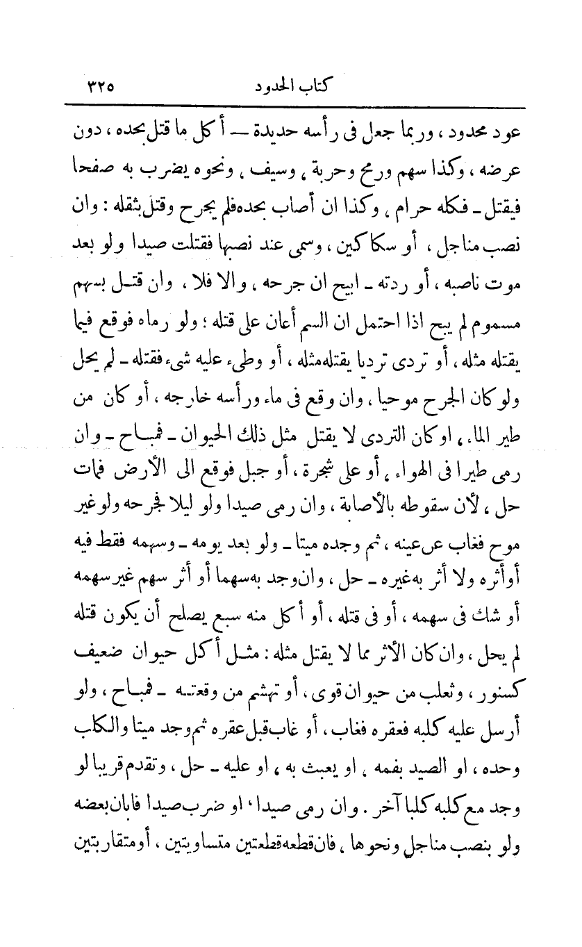 عود محدود وربما جعل في رأسه حديدة - أكل ما قتل بحده دون عرضه وكذا سهم ورمح وحربة وسيف ونحوه يضرب به صفحا فيقتل - فكله حرام وكذا إن أصاب بحده فلم يجرح وقتل بثقله: وإن نصب مناجل وأو سكاكين وسمى عند نصبها فقتلت صيدا ولو بعد موت ناصبه أو ردته - أبيح إن جرحه وإلا فلا وإن قتل بسهم مسموم لم يبح إذا احتمل أن السم أعان على قتله ولو رماه فوقع فيما يقتله مثله أو تردى ترديا يقتله مثله أو وطئ عليه شيء فقتله - لم يحل ولو كان الجرح موحيا وإن وقع في ماء ورأسه خارجه أو كان من طير الماء أو كان التردي لا يقتل مثل ذلك الحيوان - فمباح - وإن رمى طيرا في الهواء أو على شجرة أو جبل فوقع إلى الأرض فمات حل لأن سقوطه بالإصابة وإن رمى صيدا ولو ليلا فجرحه ولو غير موح فغاب عن عينه ثم وجده ميتا - ولو بعد يومه - وسهمه فقط فيه أو أثره ولا أثر به غيره - حل وإن وجد به سهما أو أثر سهم غير سهمه أو شك في سهمه أو في قتله أو أكل منه سبع يصلح أن يكون قتله لم يحل وإن كان الأثر مما لا يقتل مثله: مثل أكل حيوان ضعيف كسنور وثعلب من حيوان قوي أو تهشم من وقعته - فمباح ولو أرسل عليه كلبه فعقره فغاب أو غاب قبل عقره ثم وجد ميتا والكلب وحده أو الصيد بفمه أو يعبث به أو عليه - حل وتقدم قريبا لو وجد مع كلبه كلبا آخر وإن رمى صيدا أو ضرب صيدا فأبان بعضه ولو بنصب مناجل ونحوها فإن قطعه قطعتين متساويتين أو متقاربتين