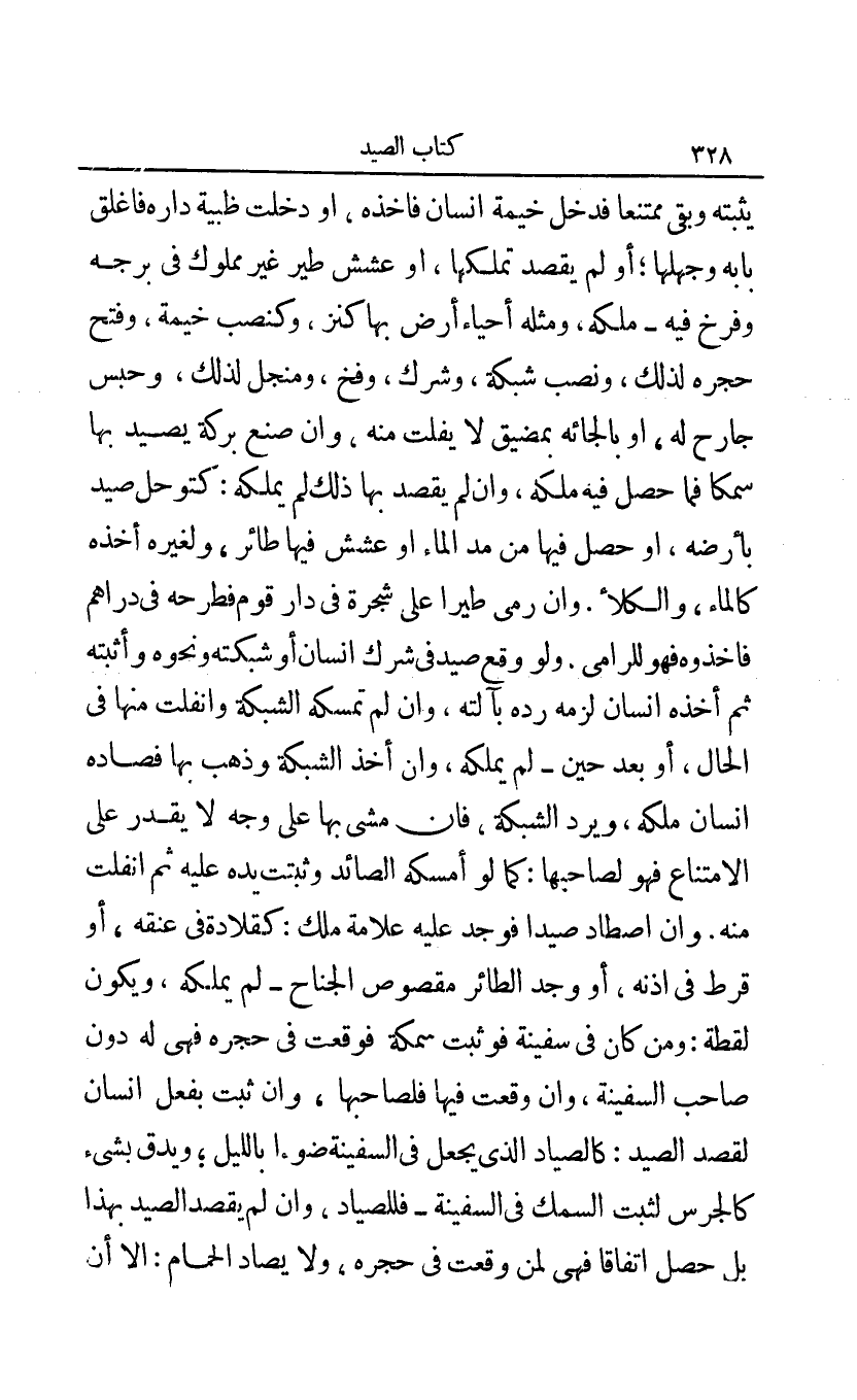 يثبته وبقي ممتنعا فدخل خيمة إنسان فأخذه أو دخلت ظبية داره فأغلق بابه وجهلها أو لم يقصد تملكها أو عشش طير غير مملوك في برجه وفرخ فيه - ملكه ومثله أحياء أرض بها كنز وكنصب خيمة وفتح حجره لذلك ونصب شبكة وشرك وفخ ومنجل لذلك وحبس جارح له أو بإلجائه بمضيق لا يفلت منه وإن صنع بركة يصيد بها سمكا فما حصل فيه ملكه وإن لم يقصد بها ذلك لم يملكه: كتوحل صيد بأرضه أو حصل فيها من مد الماء أو عشش فيها طائر ولغيره أخذه كالماء والكلأ وإن رمى طيرا على شجرة في دار قوم فطرحه في دارهم فأخذوه فهو للرامي ولو وقع صيد في شرك إنسان أو شبكته ونحوه وأثبته ثم أخذه إنسان لزمه رده بآلته وإن لم تمسكه الشبكة وانفلت منها في الحال أو بعد حين - لم يملكه وإن أخذ الشبكة وذهب بها فصاده إنسان ملكه ويرد الشبكة فإن مشى بها على وجه لا يقدر على الامتناع فهو لصاحبها: كما لو أمسكه الصائد وثبتت يده عليه ثم انفلت منه وإن اصطاد صيدا فوجد عليه علامة ملك: كقلادة في عنقه أو قرط في أذنه أو جد الطائر مقصوص الجناح - لم يملكه ويكون لقطة: ومن كان في سفينة فوثبت سمكة فوقعت في حجرة فهي له دون صاحب السفينة وإن وقعت فيها فلصاحبها وإن ثبت بفعل إنسان لقصد الصيد: كالصياد الذي يجعل في السفينة ضوءا بالليل ويدق بشيء كالجرس لثبت السمك في السفينة - فللصياد وإن لم يقصد الصيد بهذا بل حصل اتفاقا فهي لمن وقعت في حجره ولا يصاد الحمام: إلا أن