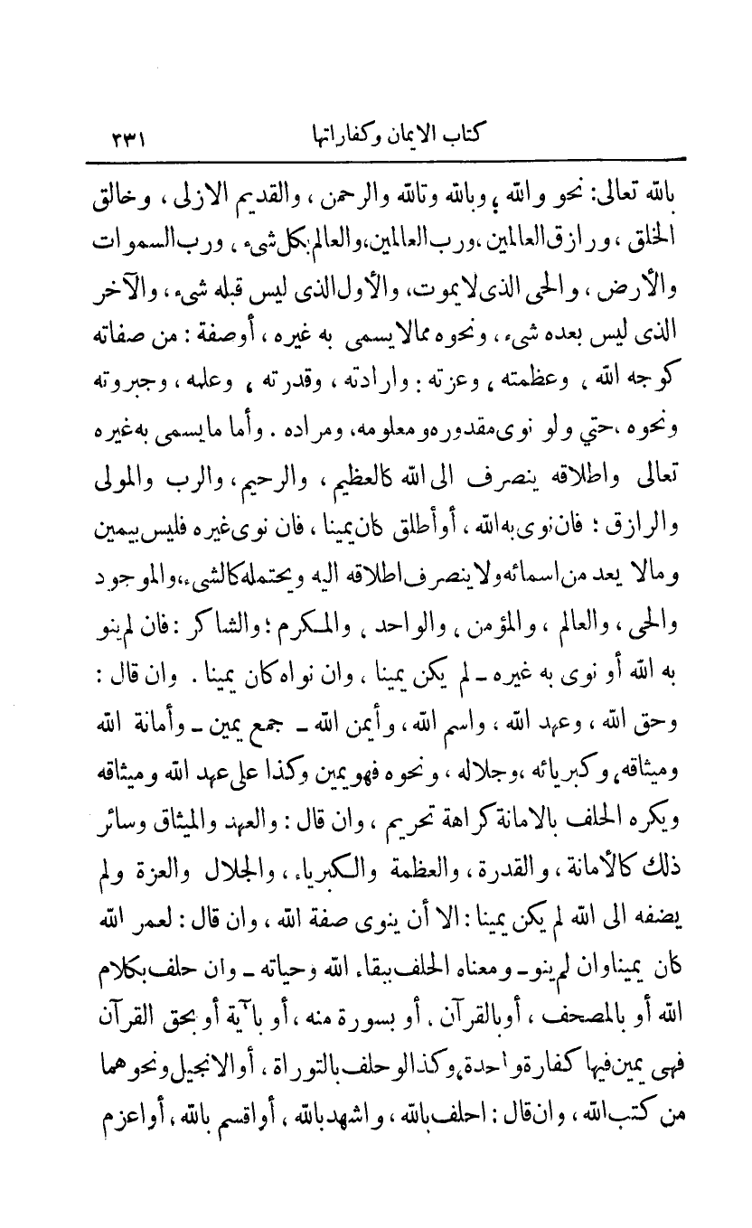 نحو والله وبالله وتالله والرحمن والقديم الأزلي وخالق الخلق ورازق العالمين ورب العالمين والعالم بكل شيء ورب السماوات والأرض والحي الذي لا يموت والأول الذي ليس قبله شيء والآخر الذي ليس بعده شيء ونحوه مما لا يسمى به غيره أو صفة: من صفاته كوجه الله وعظمته وعزته: وإرادته وقدرته وعلمه وجبروته ونحوه حتى ولو نوى مقدوره ومعلومه ومراده وأما ما يسمى به غيره تعالى وإطلاقه ينصرف إلى الله كالعظيم والرحيم والرب والمولى والرازق فإن نوى به الله أو أطلق كان يمينا فإن نوى غيره فليس بيمين وما لا يعد من أسمائه ولا ينصرف إطلاقه إليه ويحتمله كالشيء والموجود والحي والعالم والمؤمن والواحد والمكرم والشاكر: فإن لم ينو به الله أو نوى به غيره - لم يكن يمينا وإن نواه كان يمينا وإن قال: وحق الله وعهد الله واسم الله وأيمن الله - جمع يمين - وأمانة الله وميثاقه وكبريائه وجلاله ونحوه فهو يمين وكذا على عهد الله وميثاقه ويكره الحلف بالأمانة كراهة تحريم وإن قال: والعهد والميثاق وسائر ذلك كالأمانة والقدرة والعظمة والكبرياء والجلال والعزة ولم يضفه إلى الله لم يكن يمينا: إلا أن ينوي صفة الله وإن قال: لعمر الله كان يمينا وإن لم ينو - ومعناه الحلف ببقاء الله وحياته - وإن حلف بكلام الله أو بالمصحف أو بالقرآن أو بسورة منه أو بآية أو بحق القرآن فهي يمين فيها كفارة واحدة وكذا لو حلف بالتوراة أو الإنجيل ونحوهما من كتب الله وإن قال: أحلف بالله وأشهد بالله أو أقسم بالله أو أعزم