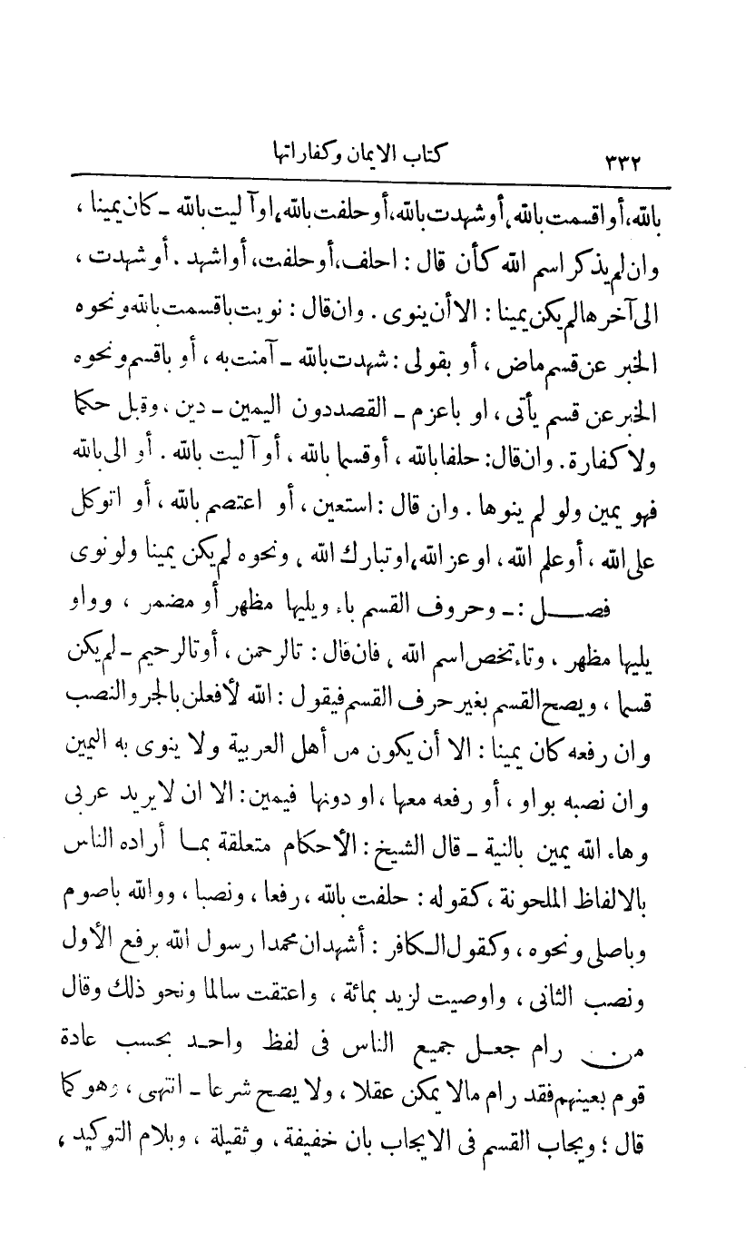 بالله أو أقسمت بالله أو شهدت بالله أو حلفت بالله أو آليت بالله - كان يمينا وإن لم يذكره اسم الله كأن قال: أحلف أو حلفت أو أشهد أو شهدت إلى آخرها لم يكن يمينا: إلا أن ينوي وإن قال: نويت بأقسمت بالله ونحوه الخبر عن قسم ماض أو بقولي: شهدت بالله - آمنت به أو بأقسم ونحوه الخبر عن قسم يأتي أو بأعزم - القصد دون اليمين - دين وقبل حكما ولا كفارة وإن قال: حلفا بالله أو قسما بالله أو آليت بالله أو آلي بالله فهو يمين ولو لم ينوها وإن قال: أستعين أو أعتصم بالله أو أتوكل على الله أو علم الله أو عز الله أو تبارك الله ونحوه لم يكن يمينا ولو نوى.