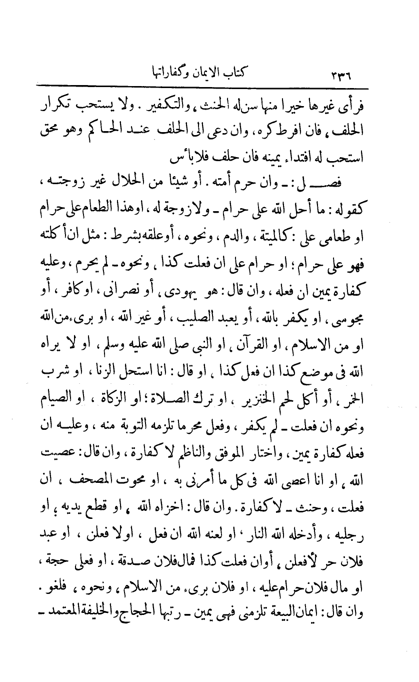 كقوله: ما أحل الله علي حرام - ولا زوجة له أو هذا الطعام علي حرام أو طعامي علي: كالميتة لدم ونحوه أو علقه بشرط: مثل إن أكلته فهو علي حرام أو حرام علي إن فعلت كذا ونحوه - لم يحرم وعليه كفارة يمين إن فعله وإن قال: هو يهودي أو نصراني أو كافر أو مجوسي أو يكفر بالله أو يعبد الصليب أو غير الله أو برئ من الله أو من الإسلام أو القرآن أو النبي صلى الله عليه وسلم أو لا يراه الله في موضع كذا إن فعل كذا أو قال: أنا أستحل الزنا أو شرب الخمر أو أكل لحم الخنزير أو ترك الصلاة أو الزكاة أو الصيام ونحوه إن فعلت - لم يكفر وفعل محرما ما تلزمه التوبة منه وعليه إن فعله كفارة يمين واختار الموفق والناظم لا كفارة وإن قال: عصيت الله أو أنا أعصي الله في كل ما أمرني به أو محوت المصحف إن فعلت وحنث - لا كفارة وإن قال: أخزاه الله أو قطع يديه أو رجليه وأدخله الله النار أو لعنه الله إن فعل أو لأفعلن أو عبد فلان حر لأفعلن أو إن فعلت كذا فمال فلان صدقة أو فعلي حجة أو مال فلان حرام عليه أو فلان برئ من الإسلام ونحوه فلغو وإن قال: إيمان البيعة تلزمني فهي يمين - رتبها الحجاج والخليفة المعتمد -