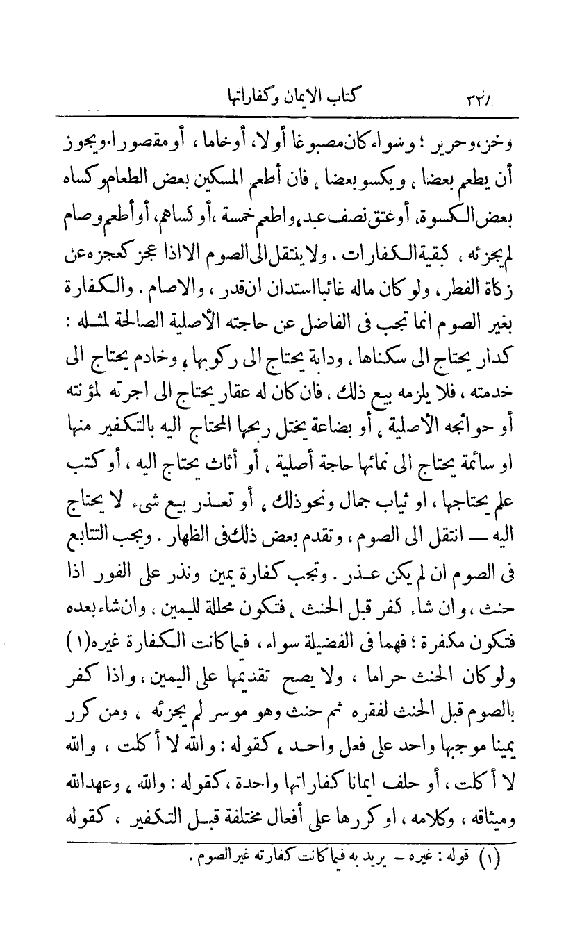 وخز وحرير وسواء كان مصبوغا أو لا أو خاما أو مقصورا ويجوز أن يطعم بعضا ويكسو بعضا فإن أطعم المسكين بعض الطعام وكساه بعض الكسوة أو عتق نصف عبد وأطعم خمسة أو كساهم أو أطعم وصام لم يجزئه كبقية الكفارات ولا ينتقل إلى الصوم إلا إذا عجز كعجزه عن زكاة الفطر ولو كان ماله غائبا استدان إن قدر وإلا صام والكفارة بغير الصوم إنما تجب في الفاضل عن حاجته الأصلية الصالحة لمثله: كدار يحتاج إلى يكناها ودابة يحتاج إلى ركوبها وخادم يحتاج إلى خدمته فلا يلزمه بيع ذلك فإن كان له عقار يحتاج إلى أجرته لمؤنته أو حوائجه الأصلية أو بضاعة يختل ربحها المحتاج إليه بالتكفير منها أو سائمة يحتاج إلى نمائها حاجة أصلية أو أثاث يحتاج إليه أو كتب علم يحتاجها أو ثياب جماع ونحو ذلك أو تعذر بيع شيء لا يحتاج إليه - انتقل إلى الصوم وتقدم بعض ذلك في الظهار ويجب التتابع في الصوم إن لم يكن عذر وتجب كفارة يمين ونذر على الفور إذا حنث وإن شاء كفر قبل الحنث فتكون محللة لليمين وإن شاء بعده فتكون مكفرة فهما في الفضيلة سواء فيما كانت الكفارة غيره1 ولو كان الحنث حراما ولا يصح تقديمها على اليمين وإذا كفر بالصوم قبل الحنث لفقره ثم حنث وهو موسر لم يجزئه ومن كرر يمينا موجبها واحد على فعل واحد كقوله: والله لا أكلت والله لا أكلت أو حلف أيمانا كفارتها واحدة كقوله: والله وعهد الله وميثاقه وكلامه أو كررها على أفعال مختلفة قبل التكفير، كقوله